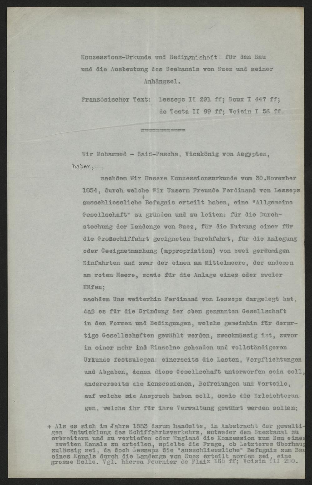 Konzessions-Urkunde und Bedingnisheft für den Bauund die Ausbeutung des Seekanals von Suez und seinerAnhängsel.Französischer Text: Lesseps II 291 ff; Roux I 447 ff;de Testa II 99 ff; Voisin I 56 ff.Wir Mohammed- Said-Pascha, Vicekönig von Aegypten,haben,nachdem Wir Unsere Konzessionsurkunde vom 30. November1854, durch welche Wir Unserm Freunde Ferdinand von Lessepsausschliessliche+ Befugnis erteilt haben, eine„AllgemeineGesellschaft" zu gründen und zu leiten: für die Durch-stechung der Landenge von Suez, für die Nutzung einer fürdie Großschiffahrt geeigneten Durchfahrt, für die Anlegungoder Geeignetmachung(appropriation) von zwei geräumigenEinfahrten und zwar der einen am Mittelmeere, der anderenam roten Meere, sowie für die Anlage eines oder zweierHäfen;nachdem Uns weiterhin Ferdinand von Lesseps dargelegt hat,daß es für die Gründung der oben genannten Gesellschaftin den Formen und Bedingungen, welche gemeinhin für derar-tige Gesellschaften gewählt werden, zweckmässig ist, zuvorin einer mehr ins Einzelne gehenden und vollständigerenUrkunde festzulegen: einerseits die Lasten, Verpflichtungenund Abgaben, denen diese Gesellschaft unterworfen sein soll,andererseits die Konzessionen, Befreiungen und Vorteile,auf welche sie Anspruch haben soll, sowie die Erleichterun-gen, welche ihr für ihre Verwaltung gewährt werden sollen;+ Als es sich im Jahre 1883 darum handelte, in Anbetracht der gewalti-gen Entwicklung des Schiffahrtsverkehrs, entweder den Suezkanal zuerbreitern und zu vertiefen oder England die Konzession zum Bau einezweiten Kanals zu erteilen, spielte die Frage, ob Letzteres überhauptzulässig sei, da doch Lesseps die"ausschliessliche" Befugnis zum Baueines Kanals durch die Landenge von Suez erteilt worden sei, einegrosse Rolle. Vgl. hierzu Fournier de Flaix 165 ff; Voisin III 200.