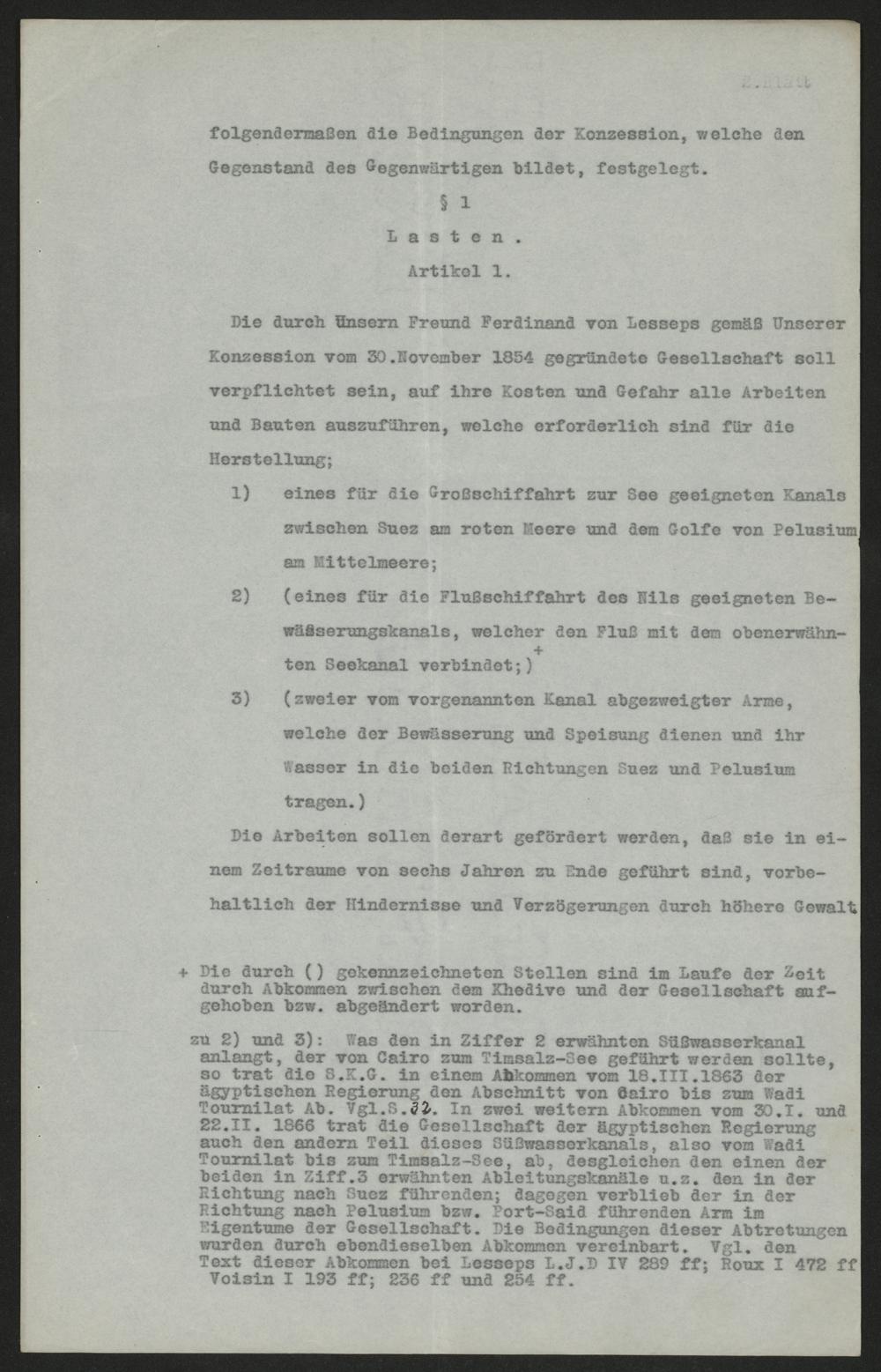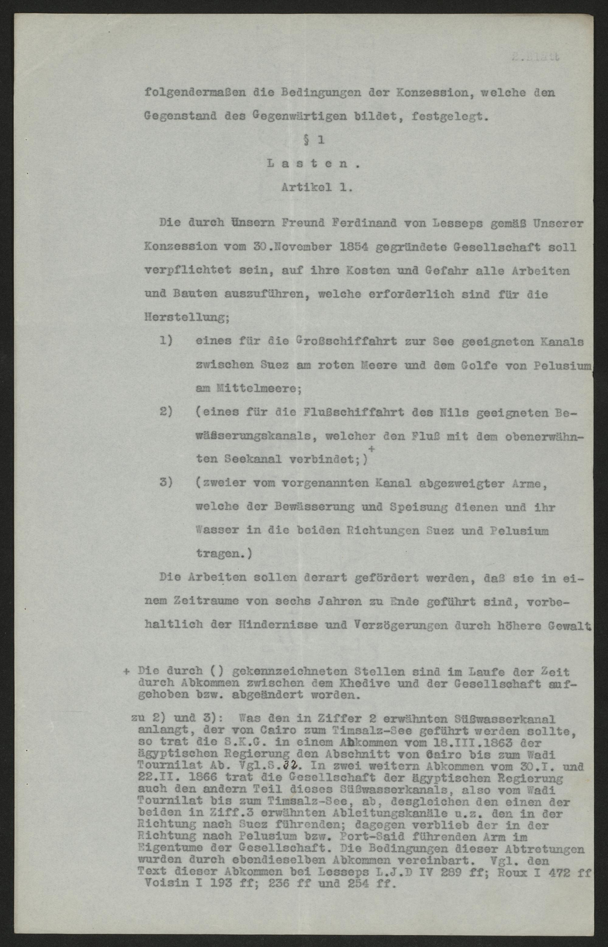 folgendermaßen die Bedingungen der Konzession, welche denGegenstand des Gegenwärtigen bildet, festgelegt.§ 1Lasten.Artikel 1.Die durch Unsern Freund Ferdinand von Lesseps gemäß UnsererKonzession vom 30. November 1854 gegründete Gesellschaft sollverpflichtet sein, auf ihre Kosten und Gefahr alle Arbeitenund Bauten auszuführen, welche erforderlich sind für dieHerstellung;1) eines für die Großschiffahrt zur See geeigneten Kanalszwischen Suez am roten Meere und dem Golfe von Pelusiumam Mittelmeere;2)(eines für die Flußschiffahrt des Nils geeigneten Be-wässerungskanals, welcher den Fluß mit dem obenerwähn-ten Seekanal verbindet;)+3)(zweier von vorgenannten Kanal abgezweigter Arme,welche der Bewässerung und Speisung dienen und ihrWasser in die beiden Richtungen Suez und Pelusiumtragen.)Die Arbeiten sollen derart gefördert werden, daß sie in ei-nem Zeitraume von sechs Jahren zu Ende geführt sind, vorbe-haltlich der Hindernisse und Verzögerungen durch höhere Gewalt.+ Die durch() gekennzeichneten Stellen sind im Laufe der Zeitdurch Abkommen zwischen dem Khedive und der Gesellschaft auf-gehoben bzw. abgeändert worden.zu 2) und 3): Was den in Ziffer 2 erwähnten Süßwasserkanalanlangt, der von Cairo zum Timsalz-See geführt werden sollte,so trat die S. K. G. in einem Abkommen vom 18. III. 1863 derägyptischen Regierung den Abschnitt von Cairo bis zum WadiTournilat Ab. Vgl. S. 32. In zwei weitern Abkommen vom 30.I. und22. II. 1866 trat die Gesellschaft der ägyptischen Regierungauch den andern Teil dieses Süßwasserkanals, also vom WadiTournilat bis zum Timsalz-See, ab, desgleichen den einen derbeiden in Ziff. 3 erwähnten Ableitungskanäle u. z. den in derRichtung nach Suez führenden; dagegen verblieb der in derRichtung nach Pelusium bzw. Port-Said führenden Arm imEigentume der Gesellschaft. Die Bedingungen dieser Abtretungenwurden durch ebendieselben Abkommen vereinbart. Vgl. denText dieser Abkommen bei Lesseps L. J. D IV 289 ff; Roux I 472 ff;Voisin I 193 ff; 236 ff und 254 ff.