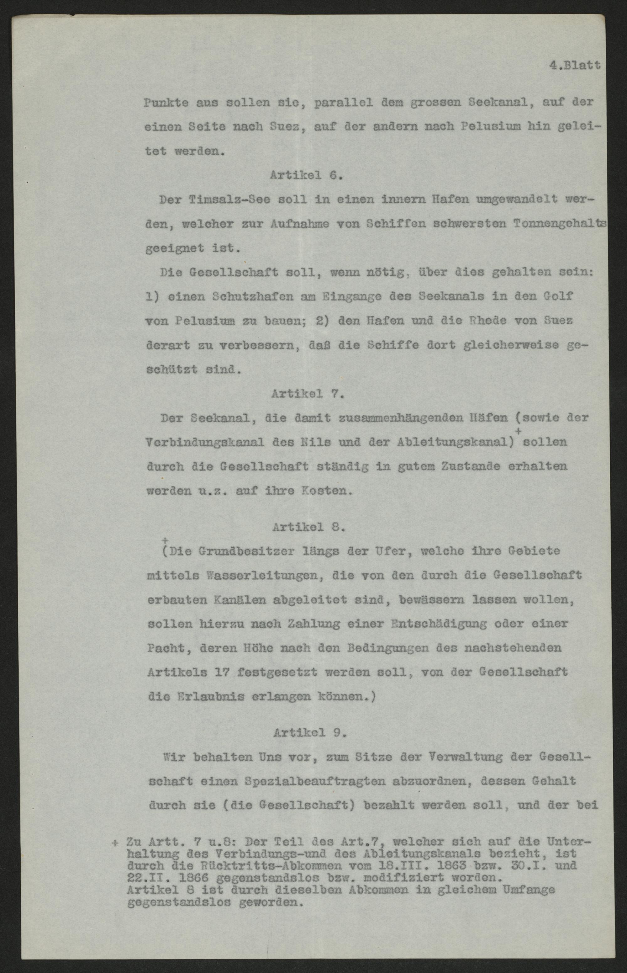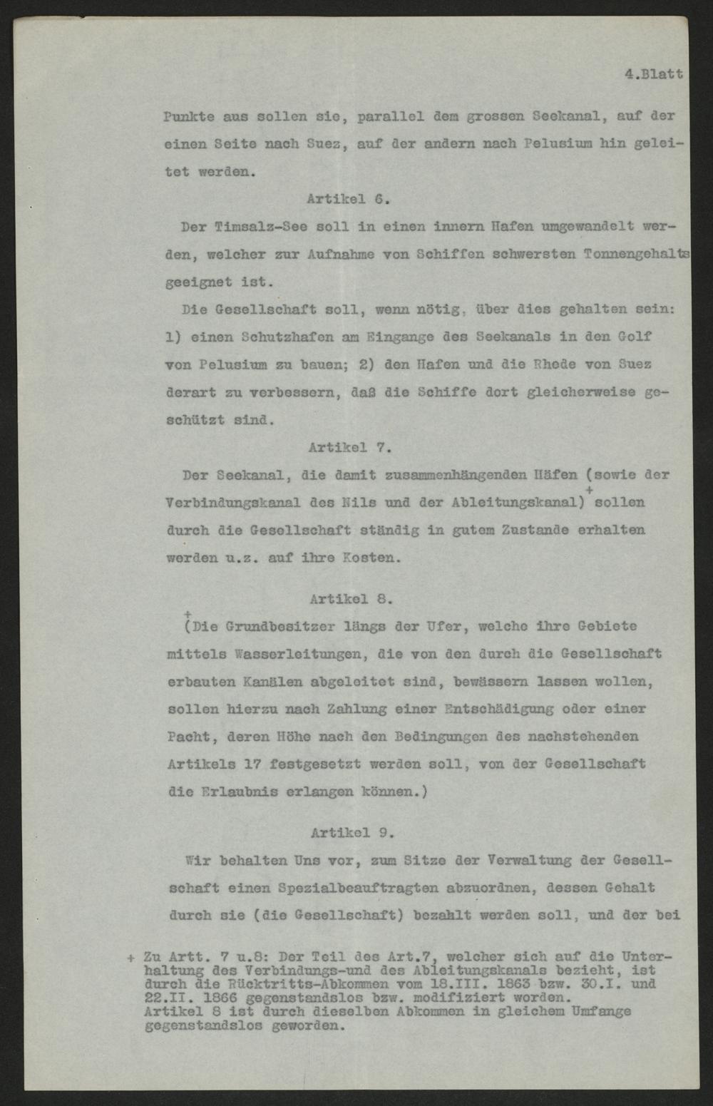 4. BlattPunkte aus sollen sie, parallel dem grossen Seekanal, auf dereinen Seite nach Suez, auf der andern nach Pelusium hin gelei-tet werden.Artikel 6.Der Timsalz-See soll in einen innern Hafen umgewandelt wer-den, welcher zur Aufnahme von Schiffen schwersten Tonnengehaltsgeeignet ist.Die Gesellschaft soll, wenn nötig, über dies gehalten sein:1) einen Schutzhafen am Eingange des Seekanals in den Golfvon Pelusium zu bauen; 2) den Hafen und die Rhede von Suezderart zu verbessern, daß die Schiffe dort gleicherweise ge-schützt sind.Artikel 7.Der Seekanal, die damit zusammenhängenden Häfen(sowie derVerbindungskanal des Nils und der Ableitungskanal)+ sollendurch die Gesellschaft ständig in gutem Zustande erhaltenwerden u. z. auf ihre Kosten.Artikel 8.+(Die Grundbesitzer längs der Ufer, welche ihre Gebietemittels Wasserleitungen, die von den durch die Gesellschafterbauten Kanälen abgeleitet sind, bewässern lassen wollen,sollen hierzu nach Zahlung einer Entschädigung oder einerPacht, deren Höhe nach den Bedingungen des nachstehendenArtikels 17 festgesetzt werden soll, von der Gesellschaftdie Erlaubnis erlangen können.)Artikel 9.Wir behalten Uns vor, zum Sitze der Verwaltung der Gesell-schaft einen Spezialbeauftragten abzuordnen, dessen Gehaltdurch sie(die Gesellschaft) bezahlt werden soll, und der bei+ Zu Artt. 7 u. 8: Der Teil des Art. 7, welcher sich auf die Unter-haltung des Verbindungs- und des Ableitungskanals bezieht, istdurch die Rücktritts-Abkommen vom 18. III. 1863 bzw. 30.1. und22. II. 1866 gegenstandslos bzw. modifiziert worden.Artikel 8 ist durch dieselben Abkommen in gleichem Umfangegegenstandslos geworden.