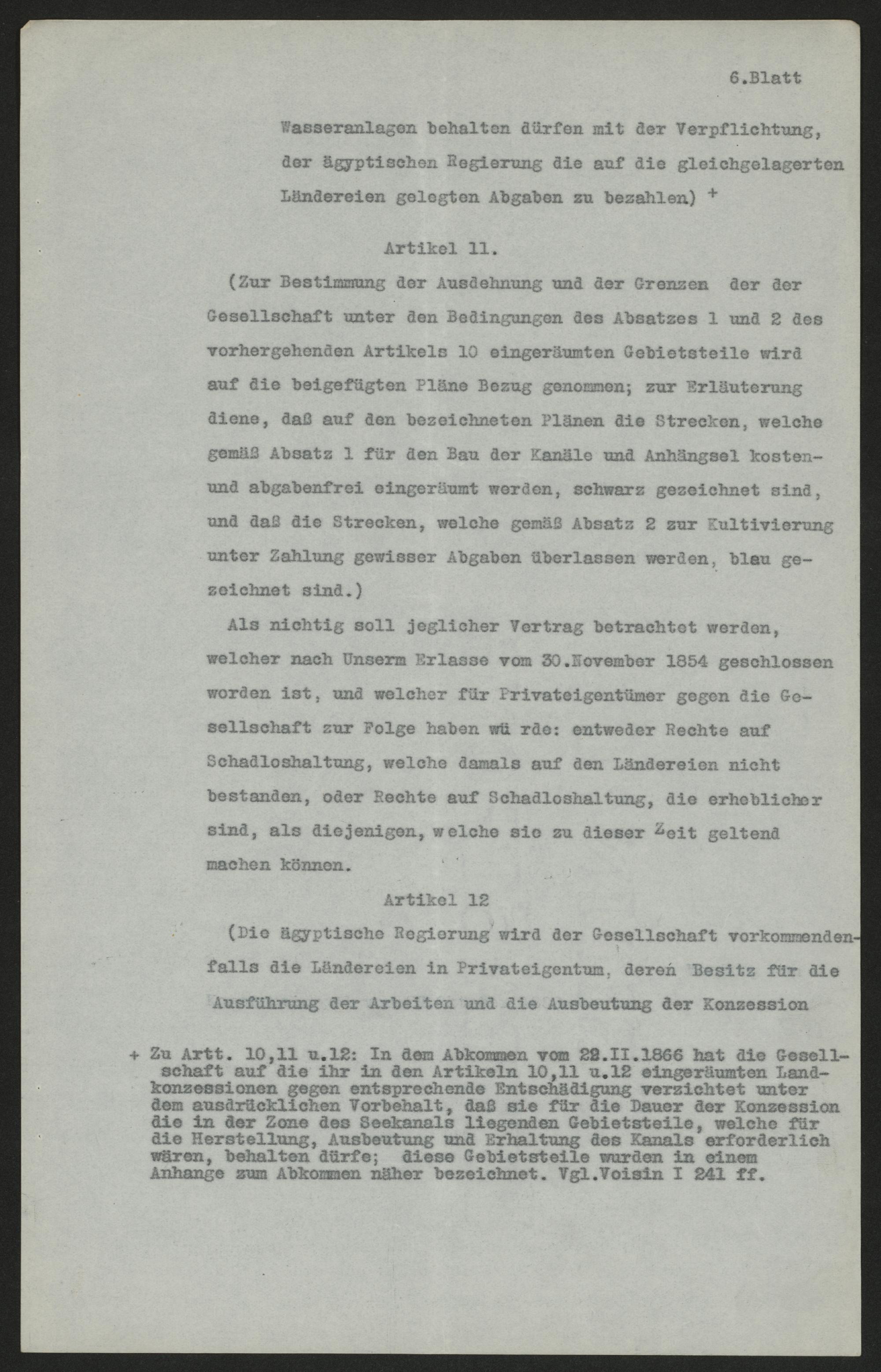 6. BlattWasseranlagen behalten dürfen mit der Verpflichtung,der ägyptischen Regierung die auf die gleichgelagertenLändereien gelegten Abgaben zu bezahlen)+Artikel 11.(Zur Bestimmung der Ausdehnung und der Grenzen der derGesellschaft unter den Bedingungen des Absatzes 1 und 2 desvorhergehenden Artikels 10 eingeräumten Gebietsteile wirdauf die beigefügten Pläne Bezug genommen; zur Erläuterungdiene, daß auf den bezeichneten Plänen die Strecken, welchegemäß Absatz 1 für den Bau der Kanäle und Anhängsel kosten-und abgabenfrei eingeräumt werden, schwarz gezeichnet sind,und daß die Strecken, welche gemäß Absatz 2 zur Kultivierungunter Zahlung gewisser Abgaben überlassen werden, blau ge-zeichnet sind.)Als nichtig soll jeglicher Vertrag betrachtet werden,welcher nach Unserm Erlasse vom 30. November 1854 geschlossenworden ist, und welcher für Privateigentümer gegen die Ge-sellschaft zur Folge haben würde: entweder Rechte aufSchadloshaltung, welche damals auf den Ländereien nichtbestanden, oder Rechte auf Schadloshaltung, die erheblichersind, als diejenigen, welche sie zu dieser Zeit geltendmachen können.Artikel 12(Die ägyptische Regierung wird der Gesellschaft vorkommenden-falls die Ländereien in Privateigentum, deren Besitz für dieAusführung der Arbeiten und die Ausbeutung der Konzession+ Zu Artt. 10, 11 u. 12: In dem Abkommen vom 22. II. 1866 hat die Gesell-schaft auf die ihr in den Artikeln 10, 11 u. 12 eingeräumten Land-konzessionen gegen entsprechende Entschädigung verzichtet unterdem ausdrücklichen Vorbehalt, daß sie für die Dauer der Konzessiondie in der Zone des Seekanals liegenden Gebietsteile, welche fürdie Herstellung, Ausbeutung und Erhaltung des Kanals erforderlichwären, behalten dürfe; diese Gebietsteile wurden in einemAnhange zum Abkommen näher bezeichnet. Vgl. Voisin I 241 ff.