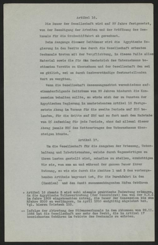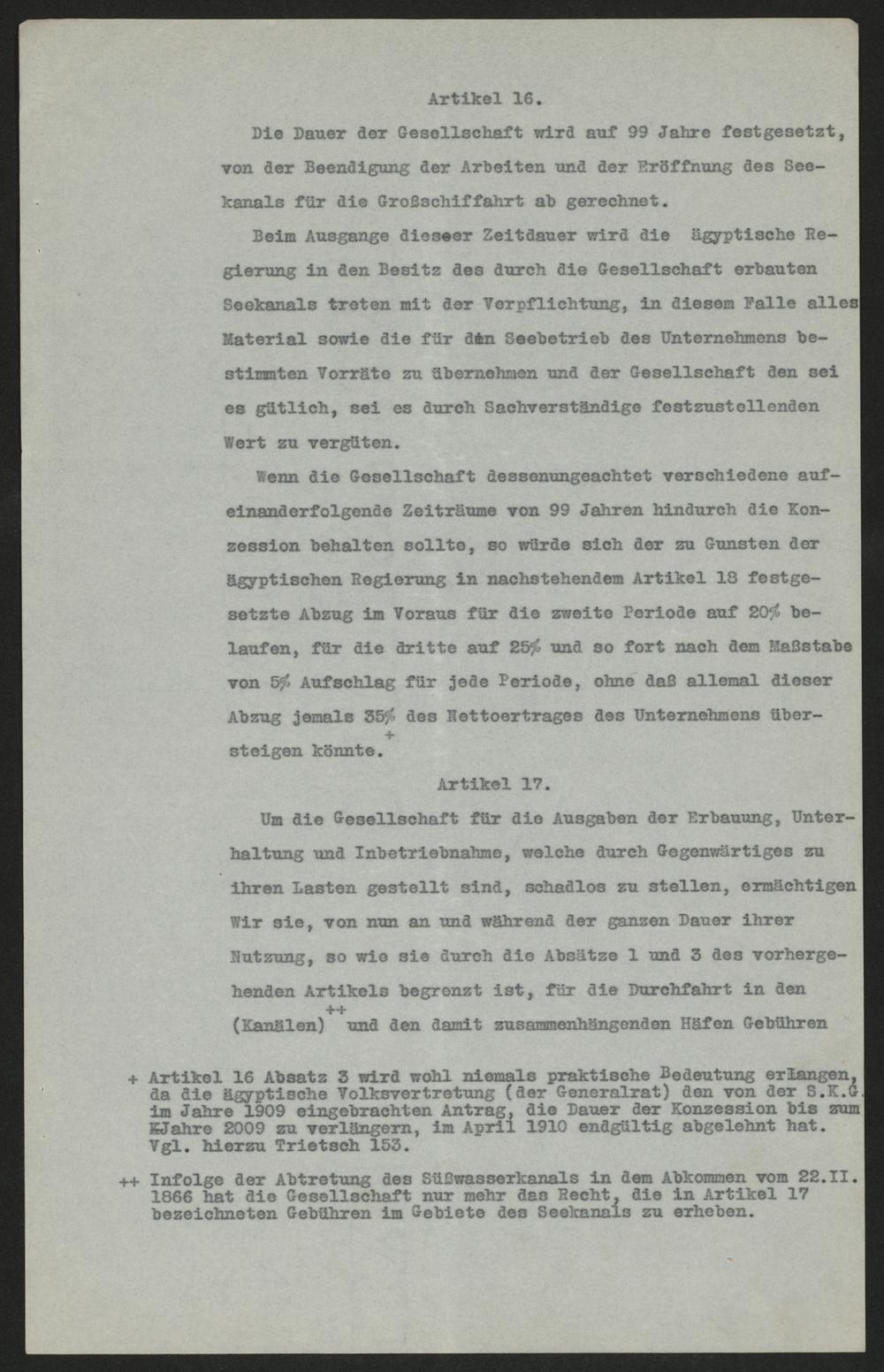 Artikel 16.Die Dauer der Gesellschaft wird auf 99 Jahre festgesetzt,von der Beendigung der Arbeiten und der Eröffnung des See-kanals für die Großschiffahrt ab gerechnet.Beim Ausgange dieser Zeitdauer wird die ägyptische Re-gierung in den Besitz des durch die Gesellschaft erbautenSeekanals treten mit der Verpflichtung, in diesem Falle allesMaterial sowie die für den Seebetrieb des Unternehmens be-stimmten Vorräte zu übernehmen und der Gesellschaft den seies gütlich, sei es durch Sachverständige festzustellendenWert zu vergüten.Wenn die Gesellschaft dessenungeachtet verschiedene auf-einanderfolgende Zeiträume von 99 Jahren hindurch die Kon-zession behalten sollte, so würde sich der zu Gunsten derägyptischen Regierung in nachstehendem Artikel 18 festge-setzte Abzug im Voraus für die zweite Periode auf 20% be-laufen, für die dritte auf 25% und so fort nach dem Maßstabevon 5% Aufschlag für jede Periode, ohne daß allemal dieserAbzug jemals 35% des Nettoertrages des Unternehmens über-steigen könnte.+Artikel 17.Um die Gesellschaft für die Ausgaben der Erbauung, Unter-haltung und Inbetriebnahme, welche durch Gegenwärtiges zuihren Lasten gestellt sind, schadlos zu stellen, ermächtigenWir sie, von nun an und während der ganzen Dauer ihrerNutzung, so wie sie durch die Absätze 1 und 3 des vorherge-henden Artikels begrenzt ist, für die Durchfahrt in den(Kanälen)++ und den damit zusammenhängenden Häfen Gebühren+ Artikel 16 Absatz 3 wird wohl niemals praktische Bedeutung erlangen,da die ägyptische Volksvertretung(der Generalrat) den von der S.K.G.im Jahre 1909 eingebrachten Antrag, die Dauer der Konzession bis zumJahre 2009 zu verlängern, im April 1910 endgültig abgelehnt hat.Vgl. hierzu Trietsch 153.++ Infolge der Abtretung des Süßwasserkanals in dem Abkommen vom 22. II.1866 hat die Gesellschaft nur mehr das Recht, die in Artikel 17bezeichneten Gebühren im Gebiete des Seekanals zu erheben.