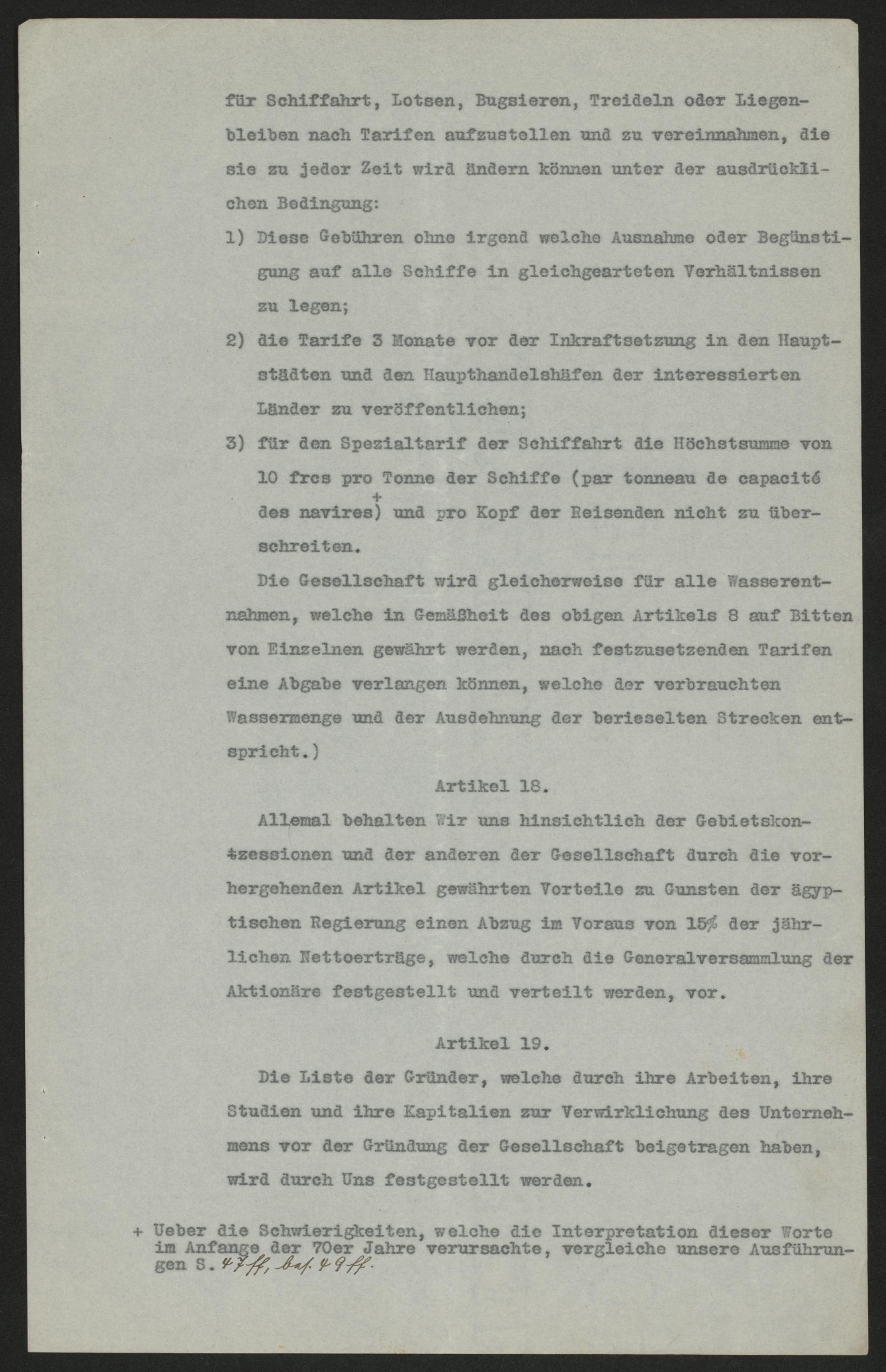 für Schiffahrt, Lotsen, Bugsieren, Treideln oder Liegen-bleiben nach Tarifen aufzustellen und zu vereinnahmen, diesie zu jeder Zeit wird ändern können unter der ausdrückli-chen Bedingung:1) Diese Gebühren ohne irgend welche Ausnahme oder Begünsti-gung auf alle Schiffe in gleichgearteten Verhältnissenzu legen;2) die Tarife 3 Monate vor der Inkraftsetzung in den Haupt-städten und den Haupthandelshäfen der interessiertenLänder zu veröffentlichen;3) für den Spezialtarif der Schiffahrt die Höchstsumme von10 frcs pro Tonne der Schiffe(par tonneau de capacitédes navires)+ und pro Kopf der Reisenden nicht zu über-schreiten.Die Gesellschaft wird gleicherweise für alle Wasserent-nahmen, welche in Gemäßheit des obigen Artikels 8 auf Bittenvon Einzelnen gewährt werden, nach festzusetzenden Tarifeneine Abgabe verlangen können, welche der verbrauchtenWassermenge und der Ausdehnung der berieselten Strecken ent-spricht.)Artikel 18.Allemal behalten Wir uns hinsichtlich der Gebietskon-zessionen und der anderen der Gesellschaft durch die vor-hergehenden Artikel gewährten Vorteile zu Gunsten der ägyp-tischen Regierung einen Abzug im Voraus von 15% der jähr-lichen Nettoerträge, welche durch die Generalversammlung derAktionäre festgestellt und verteilt werden, vor.Artikel 19.Die Liste der Gründer, welche durch ihre Arbeiten, ihreStudien und ihre Kapitalien zur Verwirklichung des Unterneh-mens vor der Gründung der Gesellschaft beigetragen haben,wird durch Uns festgestellt werden.+ Ueber die Schwierigkeiten, welche die Interpretation dieser Worteim Anfange der 70er Jahre verursachte, vergleiche unsere Ausführun-gen S. 47 ff, bes. 49 ff.