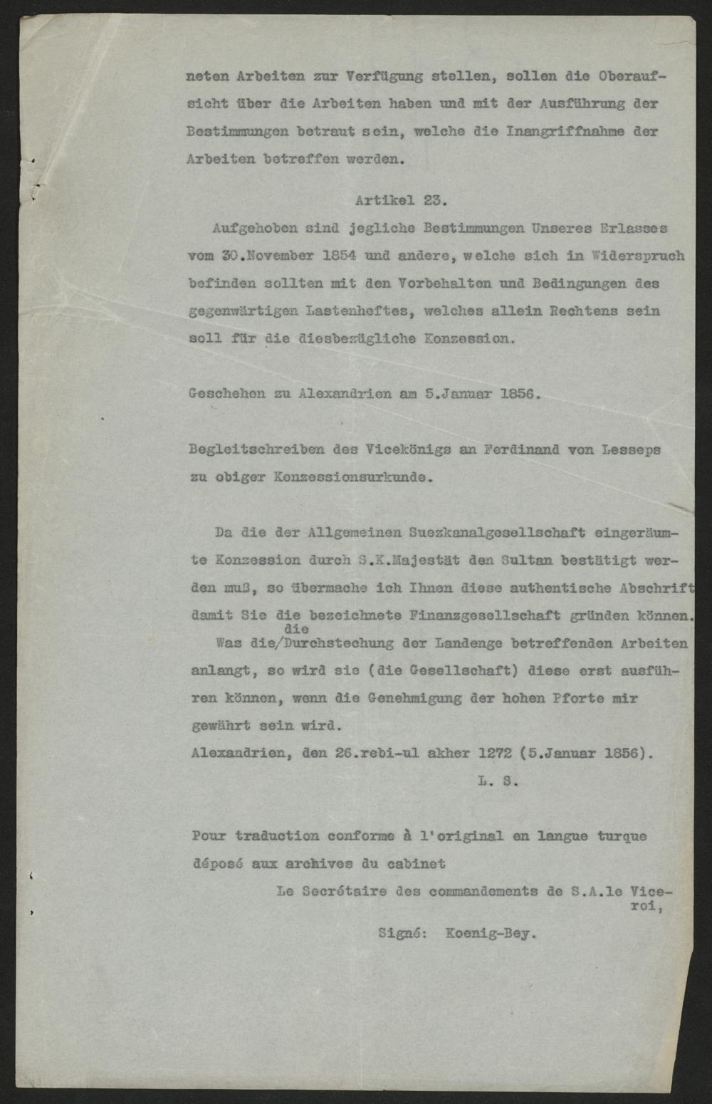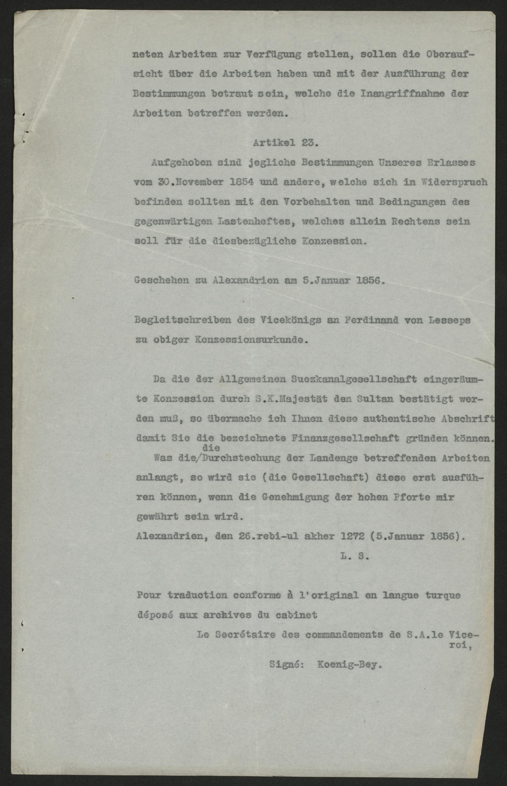 neten Arbeiten zur Verfügung stellen, sollen die Oberauf-sicht über die Arbeiten haben und mit der Ausführung derBestimmungen betraut sein, welche die Inangriffnahme derArbeiten betreffen werden.Artikel 23.Aufgehoben sind jegliche Bestimmungen Unseres Erlassesvom 30. November 1854 und andere, welche sich in Widerspruchbefinden sollten mit den Vorbehalten und Bedingungen desgegenwärtigen Lastenheftes, welches allein Rechtens seinsoll für die diesbezügliche Konzession.Geschehen zu Alexandrien am 5. Januar 1856.Begleitschreiben des Vicekönigs an Ferdinand von Lessepszu obiger Konzessionsurkunde.Da die der Allgemeinen Suezkanalgesellschaft eingeräum-te Konzession durch S.K. Majestät den Sultan bestätigt wer-den muß, so übermache ich Ihnen diese authentische Abschriftdamit Sie die bezeichnete Finanzgesellschaft gründen können.Was die die Durchstechung der Landenge betroffenden Arbeitenanlangt, so wird sie(die Gesellschaft) diese erst ausfüh-ren können, wenn die Genehmigung der hohen Pforte mirgewährt sein wird.Alexandrien, den 26. rebi-ul akher 1272(5. Januar 1856).L. S.Pour traduction conforme à l'original en langue turquedéposé aux archives du cabinetLe Secrétaire des commandements de S.A. le Vice-roi,Signé: Koenig-Bey.