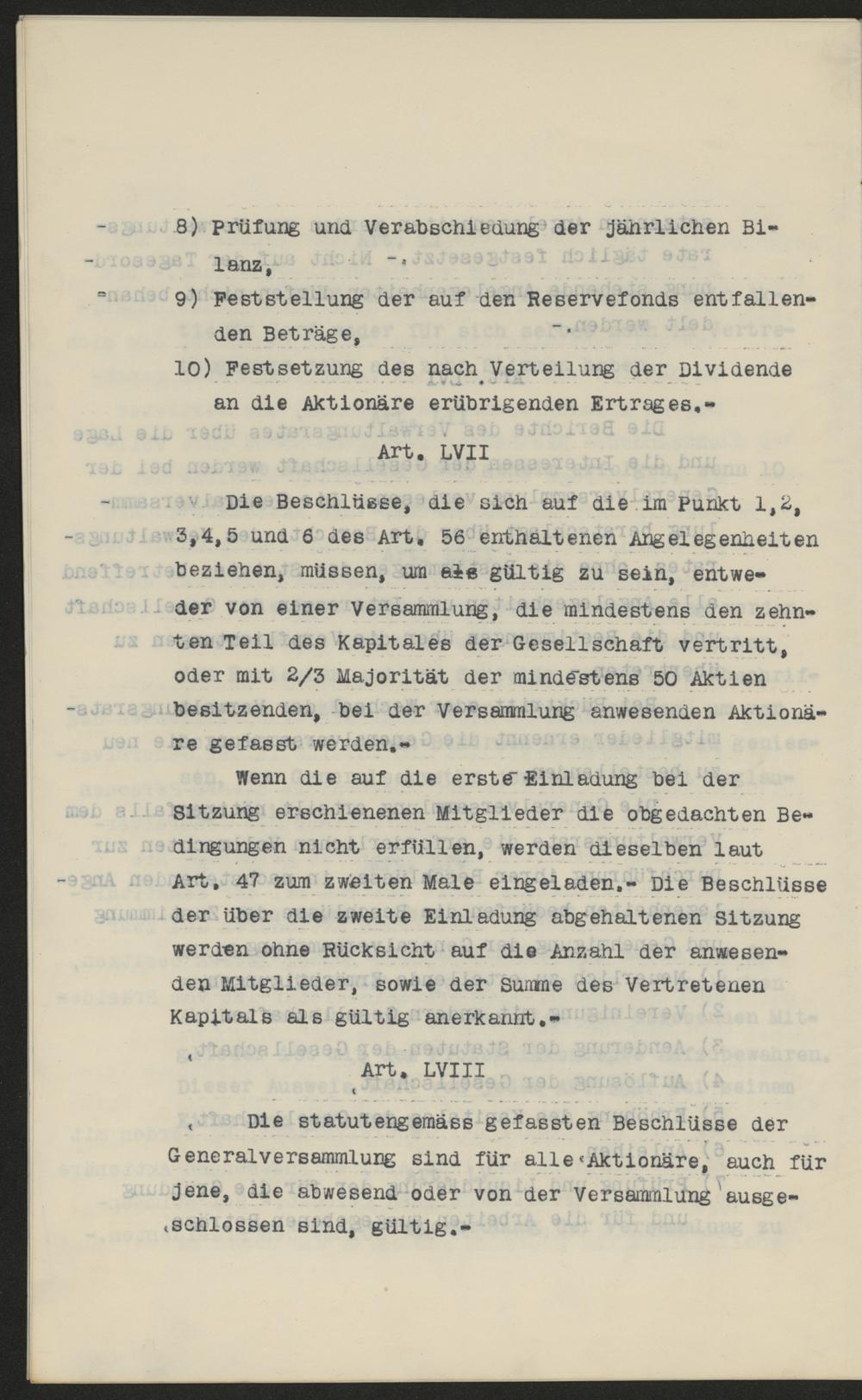 8) Prüfung und Verabschiedung der jährlichen Bi-lanz,9) Feststellung der auf den Reservefonds entfallen-den Beträge,10) Festsetzung des nach Verteilung der Dividendean die Aktionäre erübrigenden Ertrages.-Art. LVIIDie Beschlüsse, die sich auf die im Punkt 1, 2,3, 4, 5 und 6 des Art. 56 enthaltenen Angelegenheitenbeziehen, müssen, um als gültig zu sein, entwe-der von einer Versammlung, die mindestens den zehn-ten Teil des Kapitales der Gesellschaft vertritt,oder mit 2/3 Majorität der mindestens 50 Aktienbesitzenden, bei der Versammlung anwesenden Aktionä-re gefasst werden.-Wenn die auf die erste Einladung bei derSitzung erschienenen Mitglieder die obgedachten Be-dingungen nicht erfüllen, werden dieselben lautArt. 47 zum zweiten Male eingeladen.- Die Beschlüsseder über die zweite Einladung abgehaltenen Sitzungwerden ohne Rücksicht auf die Anzahl der anwesen-den Mitglieder, sowie der Summe des VertretenenKapitals als gültig anerkannt.-Art. LVIII.Die statutengemäss gefassten Beschlüsse derGeneralversammlung sind für alle Aktionäre, auch fürjene, die abwesend oder von der Versammlung ausge-schlossen sind, gültig.-