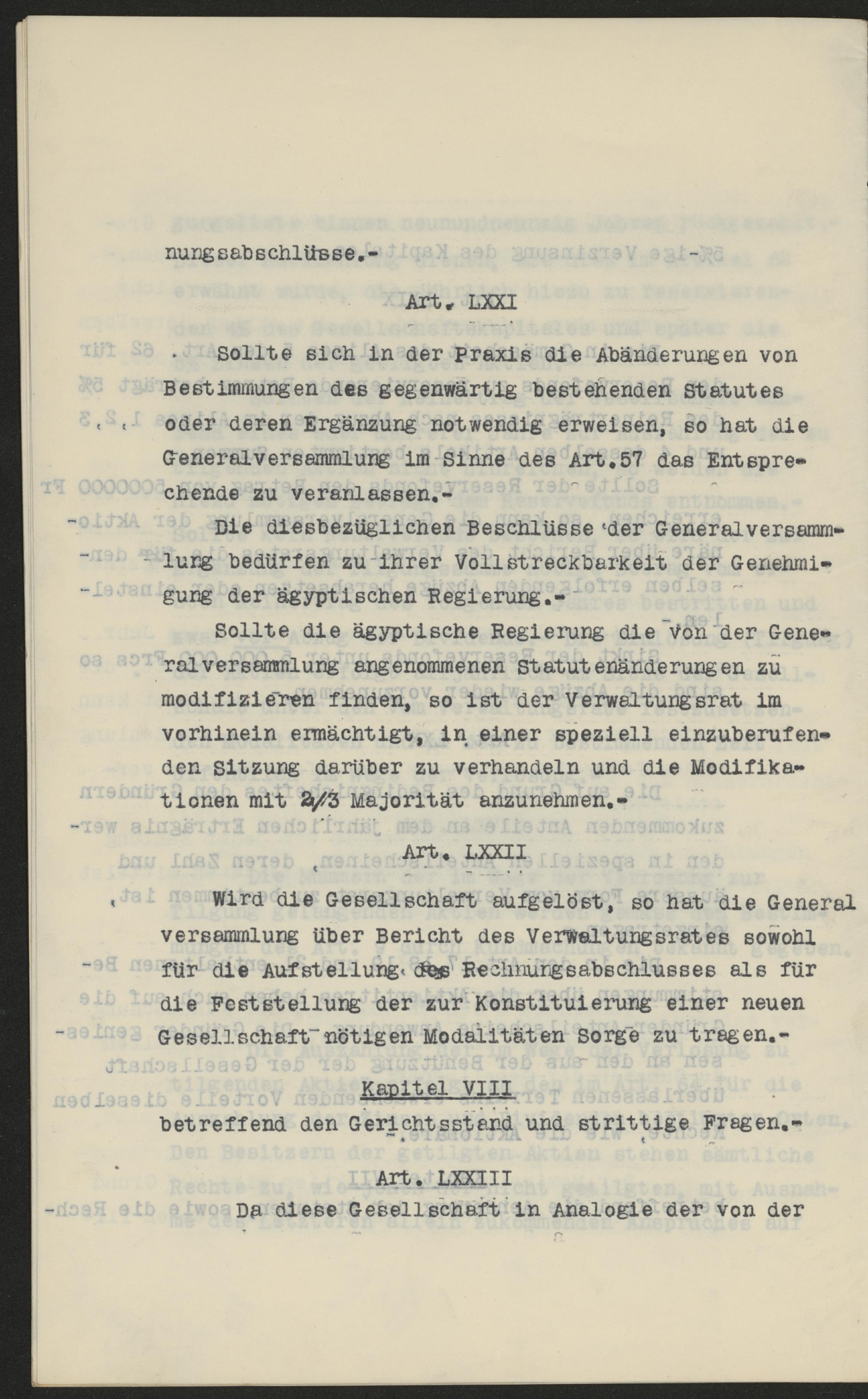 nungsabschlüsse.-Art. LXXISollte sich in der Praxis die Abänderungen vonBestimmungen des gegenwärtig bestehenden Statutesoder deren Ergänzung notwendig erweisen, so hat dieGeneralversammlung im Sinne des Art. 57 das Entspre-chende zu veranlassen.-Die diesbezüglichen Beschlüsse der Generalversamm-lung bedürfen zu ihrer Vollstreckbarkeit der Genehmi-gung der ägyptischen Regierung.Sollte die ägyptische Regierung die von der Gene-ralversammlung angenommenen Statutenänderungen zumodifizieren finden, so ist der Verwaltungsrat imvorhinein ermächtigt, in einer speziell einzuberufen-den Sitzung darüber zu verhandeln und die Modifika-tionen mit 2/3 Majorität anzunehmen.-Art. LXXIIWird die Gesellschaft aufgelöst, so hat die General-versammlung über Bericht des Verwaltungsrates sowohlfür die Aufstellung des Rechnungsabschlusses als fürdie Feststellung der zur Konstituierung einer neuenGesellschaft nötigen Modalitäten Sorge zu tragen.-Kapitel VIIIbetreffend den Gerichtsstand und strittige Fragen.-Art. LXXIIIDa diese Gesellschaft in Analogie der von der