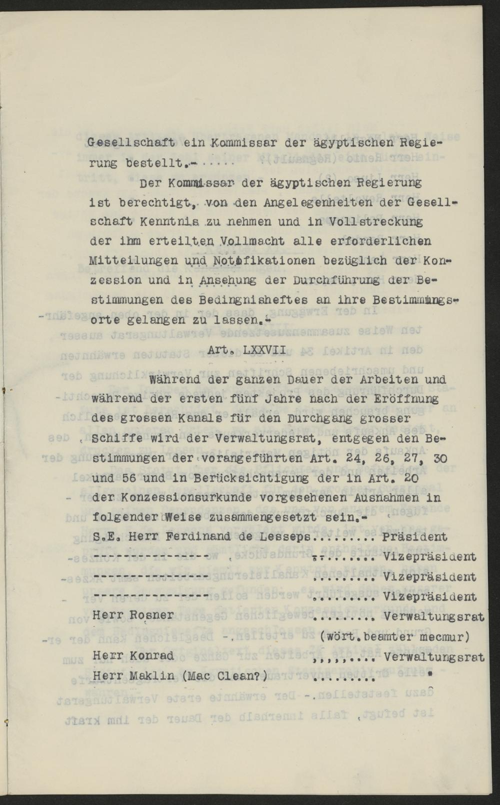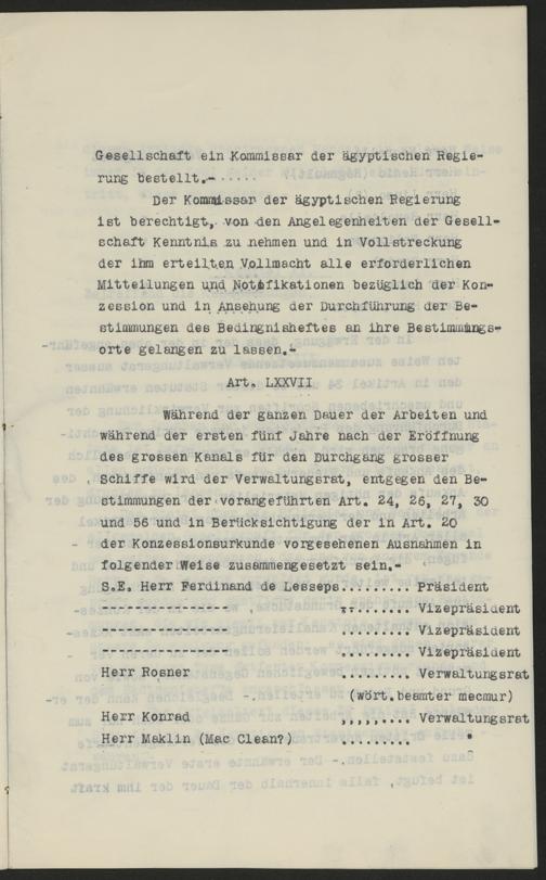 Gesellschaft ein Kommissar der ägyptischen Regie-rung bestellt.-Der Kommissar der ägyptischen Regierungist berechtigt, von den Angelegenheiten der Gesell-schaft Kenntnis zu nehmen und in Vollstreckungder ihm erteilten Vollmacht alle erforderlichenMitteilungen und Notifikationen bezüglich der Kon-zession und in Ansehung der Durchführung der Be-stimmungen des Bedingnisheftes an ihre Bestimmungs-orte gelangen zu lassen.-Art. LXXVII.Während der ganzen Dauer der Arbeiten undwährend der ersten fünf Jahre nach der Eröffnungdes grossen Kanals für den Durchgang grosserSchiffe wird der Verwaltungsrat, entgegen den Be-stimmungen der vorangeführten Art. 24, 26, 27, 30und 56 und in Berücksichtigung der in Art. 20der Konzessionsurkunde vorgesehenen Ausnahmen infolgender Weise zusammengesetzt sein.-S.E. Herr Ferdinand de Lesseps........ Präsident.............. Vizepräsident.............. Vizepräsident.............. VizepräsidentHerr Rosner......... Verwaltungsrat(wört.beamter mecmur)Herr Konrad......... VerwaltungsratHerr Maklin(Mac Clean?)............"