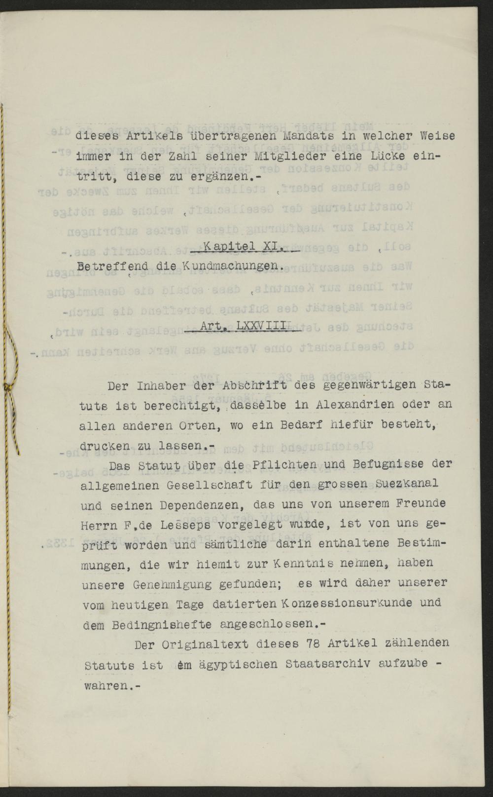 dieses Artikels übertragenen Mandats in welcher Weiseimmer in der Zahl seiner Mitglieder eine Lücke ein-tritt, diese zu ergänzen.-Kapitel XI.Betreffend die Kundmachungen.Art. LXXVIIIDer Inhaber der Abschrift des gegenwärtigen Sta-tuts ist berechtigt, dasselbe in Alexandrien oder anallen anderen Orten, wo ein Bedarf hiefür besteht,drucken zu lassen.-Das Statut über die Pflichten und Befugnisse derallgemeinen Gesellschaft für den grossen Suezkanalund seinen Dependenzen, das uns von unserem FreundeHerrn F. de Lesseps vorgelegt wurde, ist von uns ge-prüft worden und sämtliche darin enthaltene Bestim-mungen, die wir hiemit zur Kenntnis nehmen, habenunsere Genehmigung gefunden; es wird daher unserervom heutigen Tage datierten Konzessionsurkunde unddem Bedingnishefte angeschlossen.-Der Originaltext dieses 78 Artikel zählendenStatuts ist im ägyptischen Staatsarchiv aufzube-wahren.-