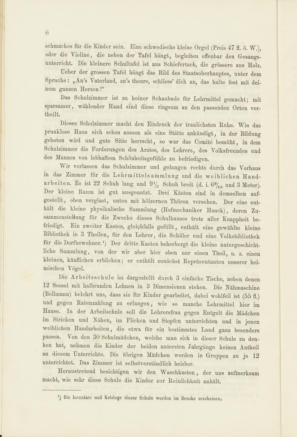 Die Arbeitsschule ist dargestellt durch 3 einfache Tische, neben denen12 Sessel mit halbrunden Lehnen in 3 Dimensionen stehen. Die Nähmaschine(Bollmann) belehrt uns, dass sie für Kinder gearbeitet, dabei wohlfeil ist (55 fl.)und gegen Batenzahlung zu erlangen, wie so manche Lehrmittel hier imHause. In der Arbeitschule soll die Lehrersfrau gegen Entgelt die Mädchenim Stricken und Nähen, im Klicken und Stopfen unterrichten und in jenenweiblichen Handarbeiten, die etwa für ein bestimmtes Land ganz besonderspassen. Von den 30 Schulmädchen, welche man sich in dieser Schule zu den-ken hat, nehmen die Kinder der beiden untersten Jahrgänge keinen Antheilan diesem Unterrichte. Die übrigen Mädchen werden in Gruppen zu je 12unterrichtet. Das Zimmer ist selbstverständlich heizbar.