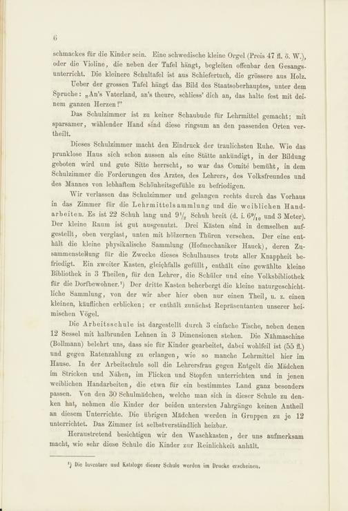 Wir verlassen das Schulzimmer und gelangen rechts durch das Vorhausin das Zimmer für die Lehrmittelsammlung und die weiblichen Hand-arbeiten. Es ist 22 Schuh, lang und 9 V 2 Schuh breit (d. i. 6 9 / 10 und 3 Meter).Der kleine Baum ist gut ausgenutzt. Drei Kästen sind in demselben auf-gestellt, oben verglast, unten mit hölzernen Thiiren versehen. Der eine ent-hält die kleine physikalische Sammlung (Hofmechaniker Hauck), deren Zu-sammenstellung für die Zwecke dieses Schulhauses trotz aller Knappheit be-friedigt. Ein zweiter Kasten, gleichfalls gefüllt, enthält eine gewählte kleineBibliothek in 3 Theilen, für den Lehrer, die Schüler und eine Volksbibliothekfür die Dorfbewohner. 1 ) Der dritte Kasten beherbergt die kleine naturgeschicht-liche Sammlung, von der wir aber hier oben nur einen Theil, u. z. einenkleinen, käuflichen erblicken; er enthält zunächst Bepräsentanten unserer hei-mischen Vögel.