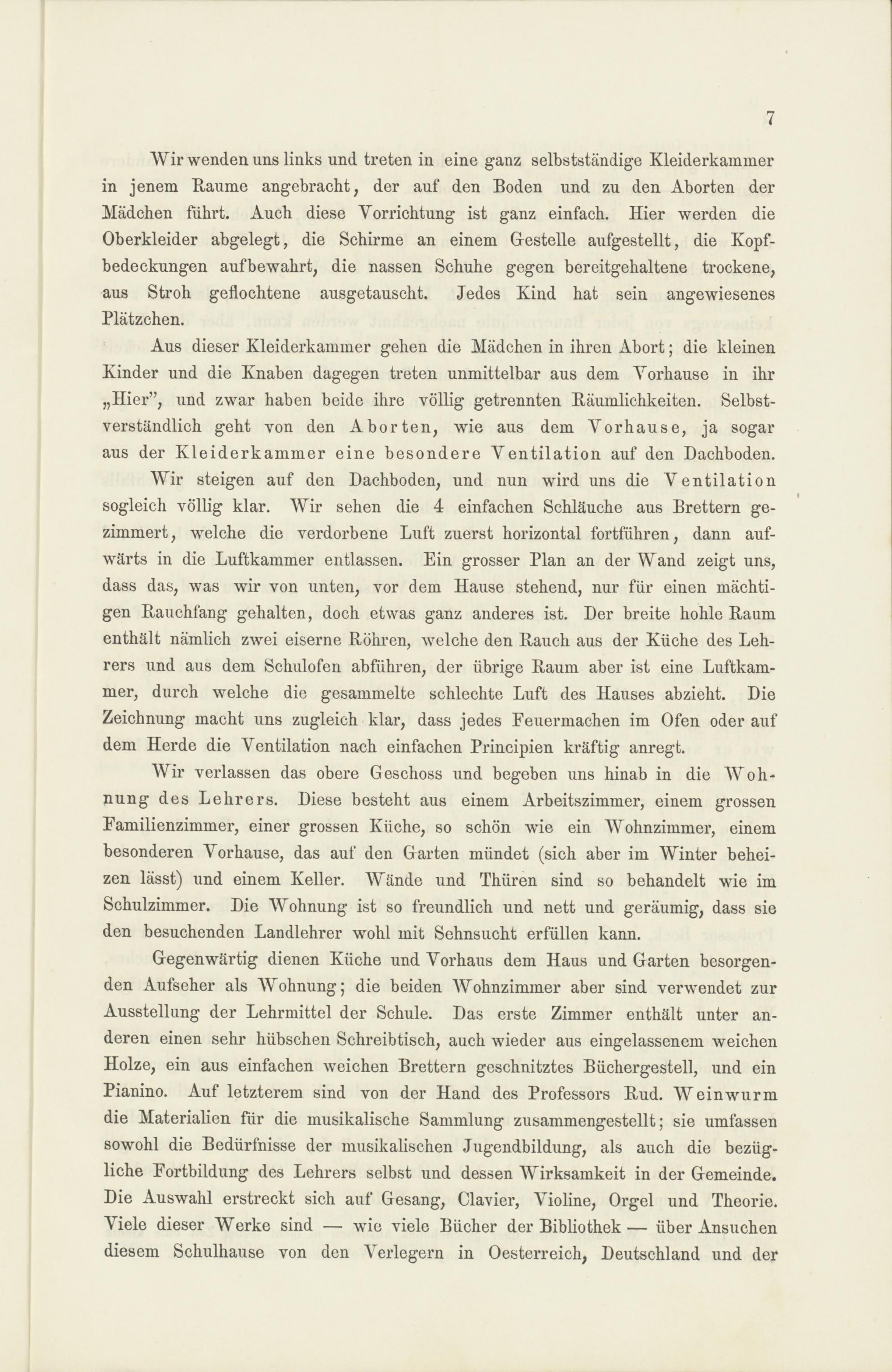 Gegenwärtig dienen Küche und Vorhaus dem Haus und Garten besorgen-den Aufseher als Wohnung; die beiden Wohnzimmer aber sind verwendet zurAusstellung der Lehrmittel der Schule. Das erste Zimmer enthält unter an-deren einen sehr hübschen Schreibtisch, auch wieder aus eingelassenem weichenHolze, ein aus einfachen weichen Brettern geschnitztes Büchergestell, und einPianino. Auf letzterem sind von der Hand des Professors Rud. Weinwurmdie Materialien für die musikalische Sammlung zusammengestellt; sie umfassensowohl die Bedürfnisse der musikalischen Jugendbildung, als auch die bezüg-liche Fortbildung des Lehrers selbst und dessen Wirksamkeit in der Gemeinde.Die Auswahl erstreckt sich auf Gesang, Clavier, Violine, Orgel und Theorie.Viele dieser Werke sind — wie viele Bücher der Bibliothek— über Ansuchendiesem Schulhause von den Verlegern in Oesterreich, Deutschland und der