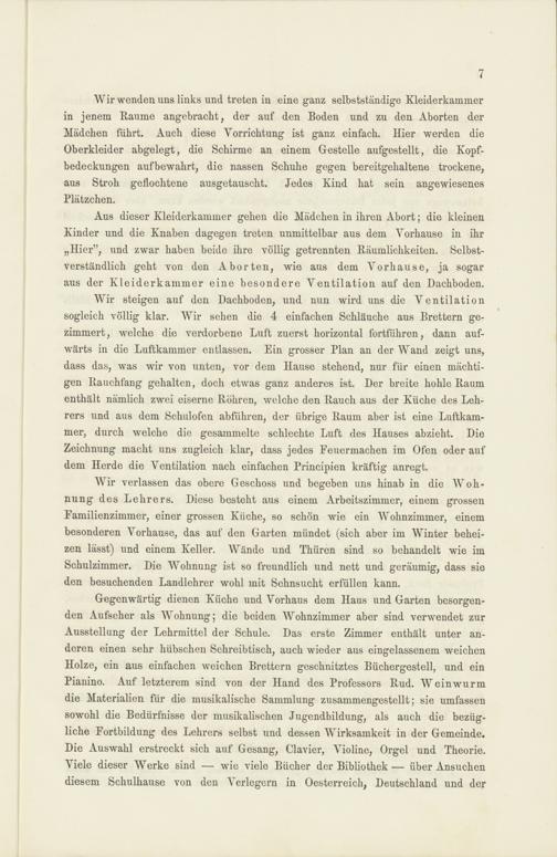 Wir verlassen das obere Geschoss und begeben uns hinab in die Woh-nung des Lehrers. Diese besteht aus einem Arbeitszimmer, einem grossenFamilienzimmer, einer grossen Küche, so schön wie ein Wohnzimmer, einembesonderen Vorhause, das auf den Garten mündet (sich aber im Winter behei-zen lässt) und einem Keller. Wände und Thüren sind so behandelt wie imSchulzimmer. Die Wohnung ist so freundlich und nett und geräumig, dass sieden besuchenden Landlehrer wohl mit Sehnsucht erfüllen kann.