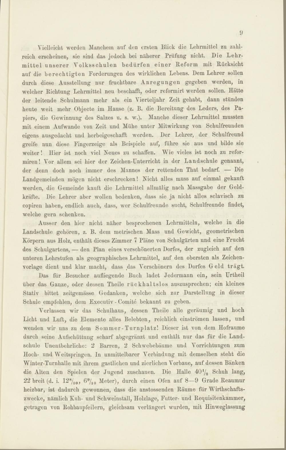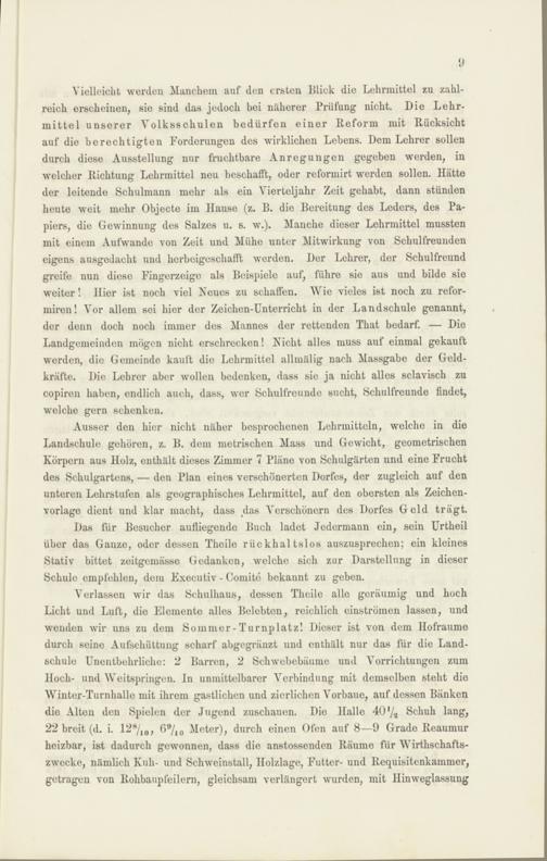 Ausser den hier nicht näher besprochenen Lehrmitteln, welche in dieLandschule gehören, z. B. dem metrischen Mass und Gewicht, geometrischenKörpern aus Holz, enthält dieses Zimmer 7 Pläne von Schulgärten und eine Fruchtdes Schulgartens, — den Plan eines verschönerten Dorfes, der zugleich auf denunteren Lehrstufen als geographisches Lehrmittel, auf den obersten als Zeichen-vorlage dient und klar macht, dass das Verschönern des Dorfes Geld trägt.