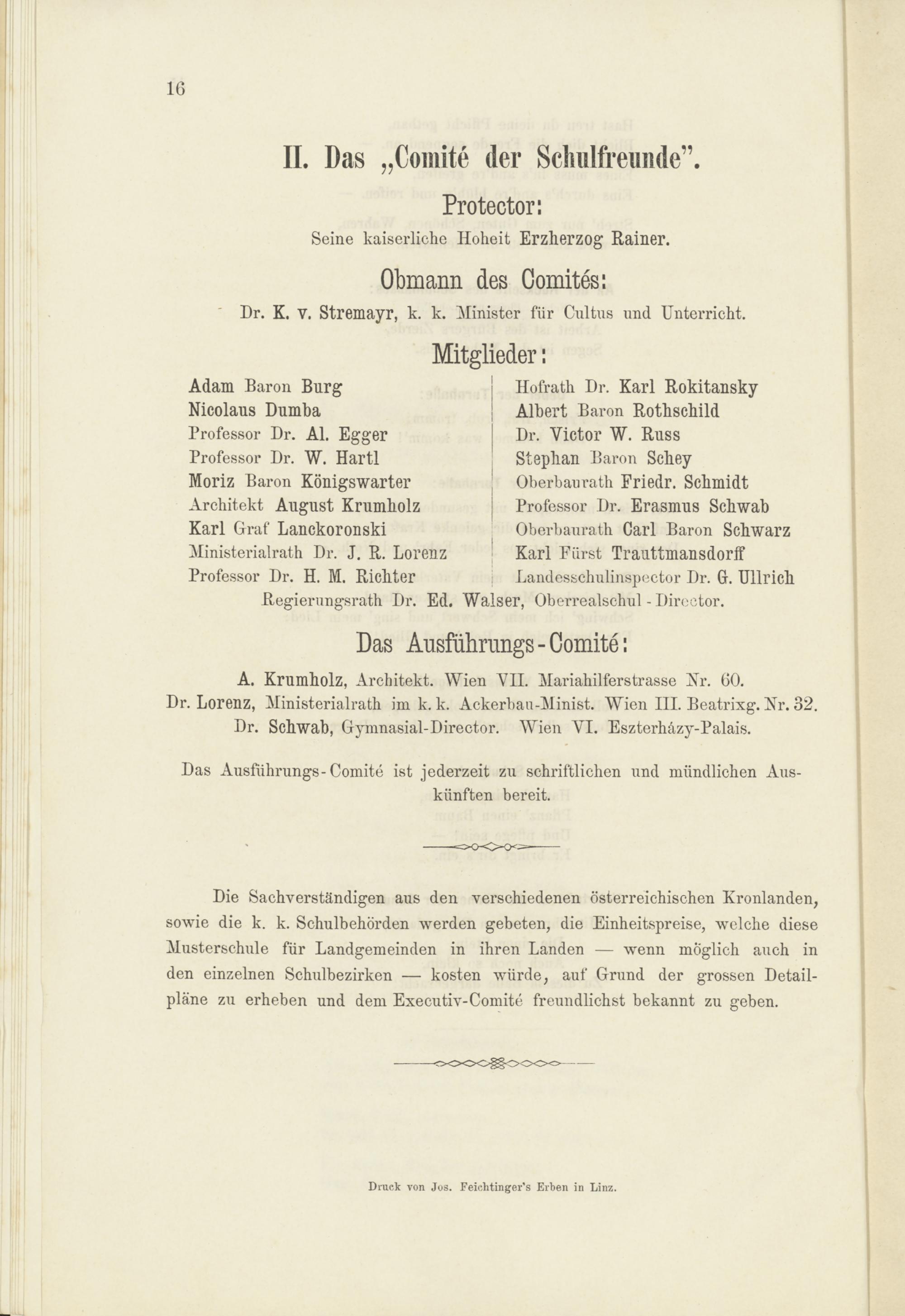 i Hofrath Dr. Karl Rokitansky! Albert Baron RothschildDr. Victor W. RussStephan Baron ScheyOberbaurath Friedr. SchmidtProfessor Dr. Erasmus SchwabOberbaurath Carl Baron SchwarzI Karl Fürst Trauttmansdorffj Landesschulinspector Dr. G. UllrichIser, Oberrealschul - Director.
