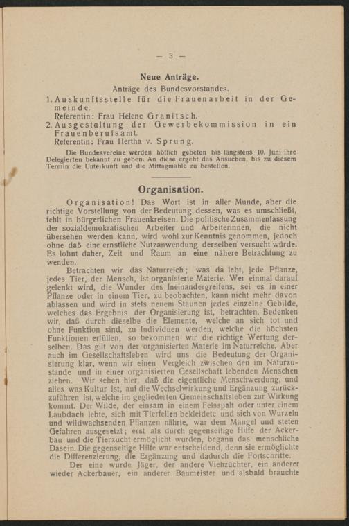 Organisation! Das Wort ist in aller Munde, aber dierichtige Vorstellung von der Bedeutung dessen, was es umschließt,fehlt in bürgerlichen Frauenkreisen. Die politische Zusammenfassungder sozialdemokratischen Arbeiter und Arbeiterinnen, die nichtübersehen werden kann, wird wohl zur Kenntnis genommen, jedochohne daß eine ernstliche Nutzanwendung derselben versucht würde.Es lohnt daher, Zeit und Raum an eine nähere Betrachtung zuwenden.