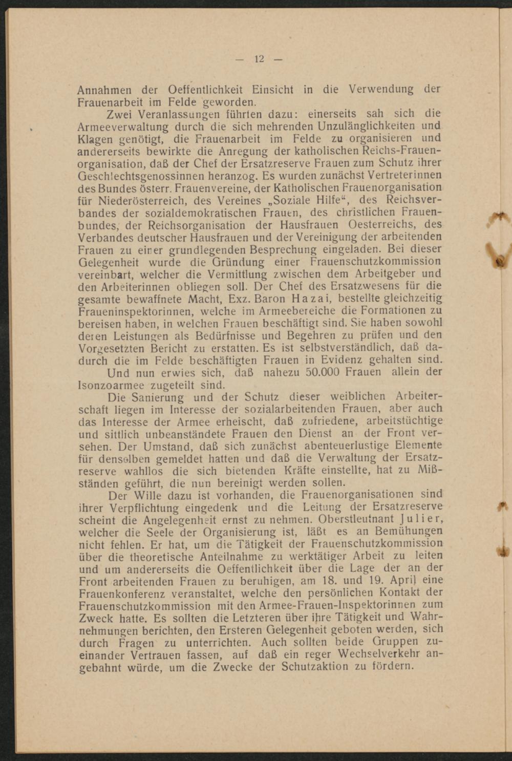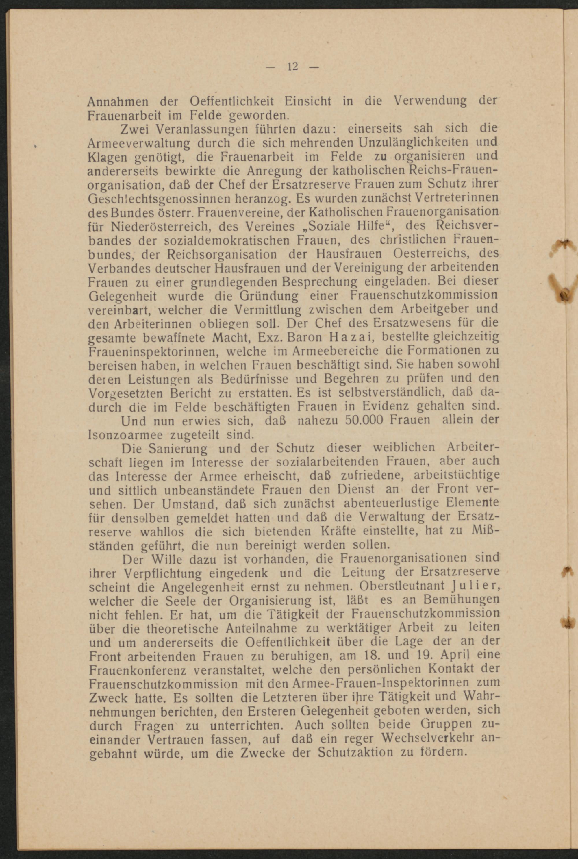 Zwei Veranlassungen führten dazu: einerseits sah sich dieArmeeverwaltung durch die sich mehrenden Unzulänglichkeiten undKlagen genötigt, die Frauenarbeit im Felde zu organisieren undandererseits bewirkte die Anregung der katholischen Reichs-Frauen-organisation, daß der Chef der Ersatzreserve Frauen zum Schutz ihrerGeschtechtsgenossinnen heranzog. Es wurden zunächst Vertreterinnendes Bundes österr. Frauenvereine, der Katholischen Frauenorganisationfür Niederösterreich, des Vereines „Soziale Hilfe“, des Reichsver-bandes der sozialdemokratischen Frauen, des christlichen Frauen-bundes, der Reichsorganisation der Hausfrauen Oesterreichs, desVerbandes deutscher Hausfrauen und der Vereinigung der arbeitendenFrauen zu einer grundlegenden Besprechung eingeladen. Bei dieserGelegenheit wurde die Gründung einer Frauenschutzkommissionvereinbart, welcher die Vermittlung zwischen dem Arbeitgeber undden Arbeiterinnen obliegen soll. Der Chef des Ersatzwesens für diegesamte bewaffnete Macht, Exz. Baron Hazai, bestellte gleichzeitigFraueninspektorinnen, welche im Armeebereiche die Formationen zubereisen haben, in welchen Frauen beschäftigt sind. Sie haben sowohlderen Leistungen als Bedürfnisse und Begehren zu prüfen und denVorgesetzten Bericht zu erstatten. Es ist selbstverständlich, daß da-durch die im Felde beschäftigten Frauen in Evidenz gehalten sind.