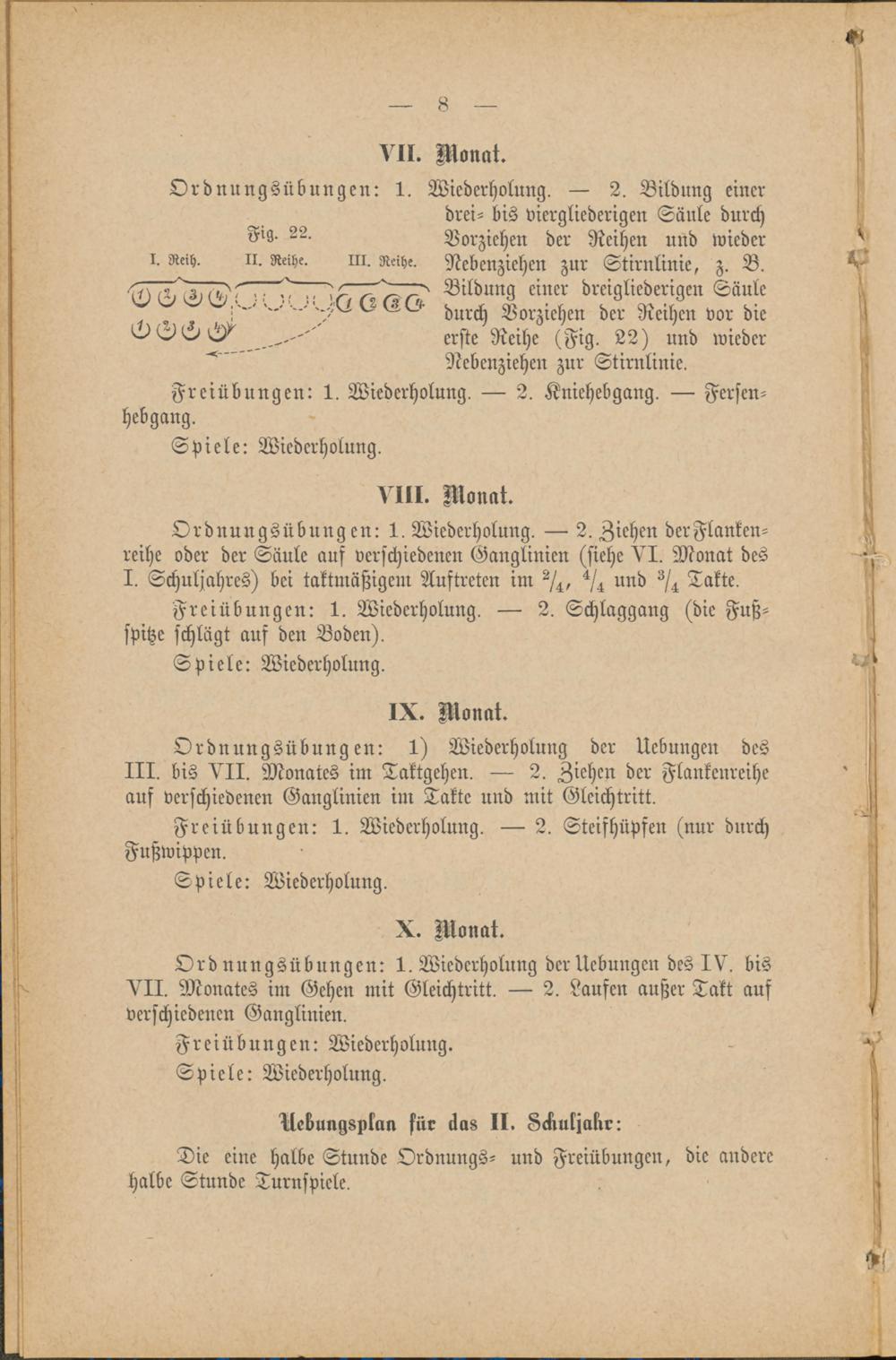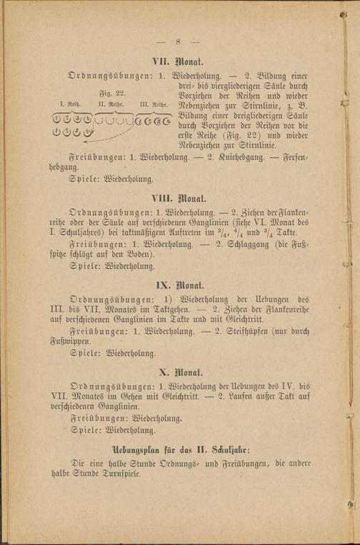 Ordnungsübungen: 1. Wiederholung der Uebungen des IV. bisVII. Monates im Gehen mit Gleichtritt. — 2. Laufen außer Takt aufverschiedenen Ganglinien.
