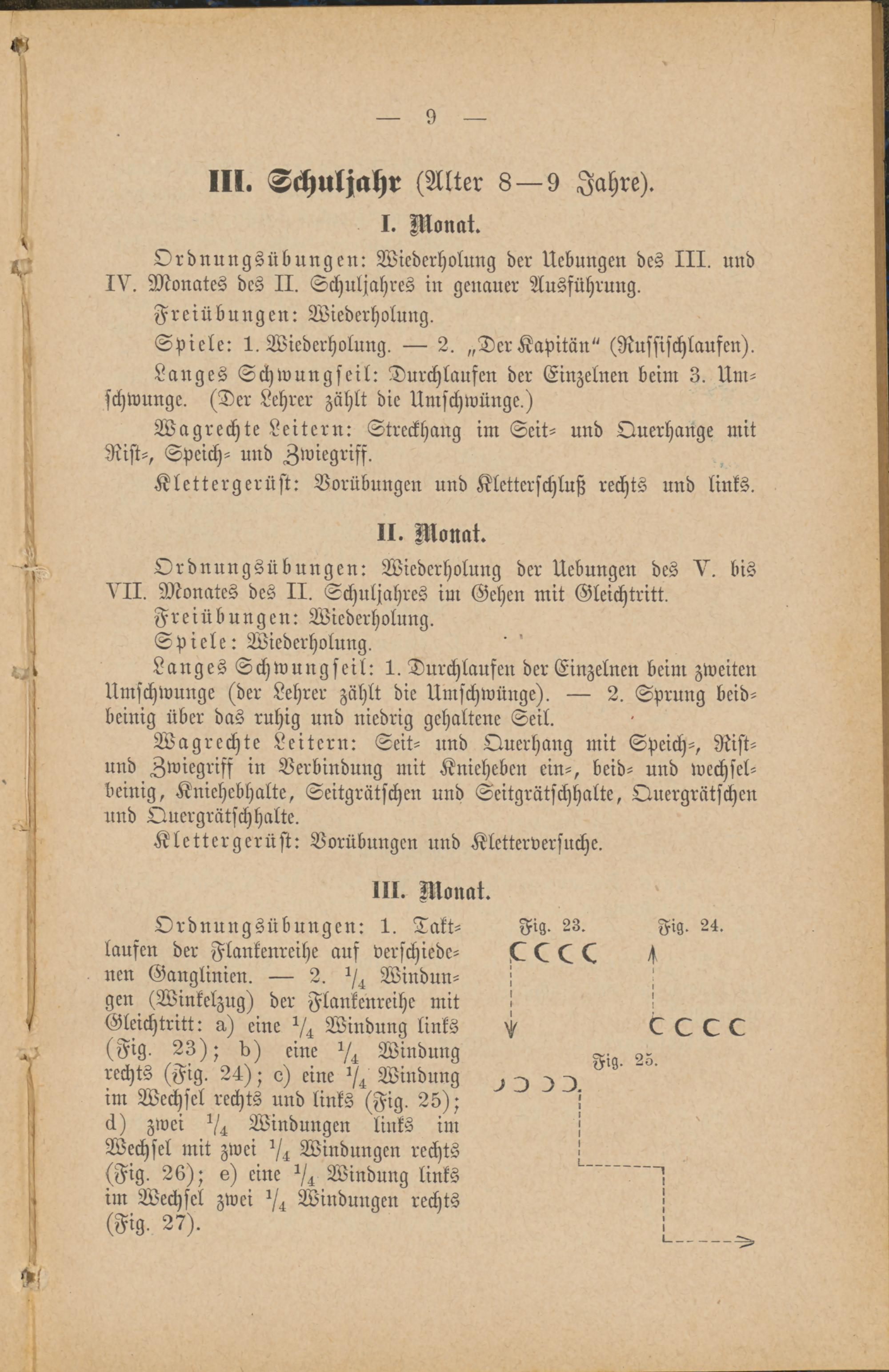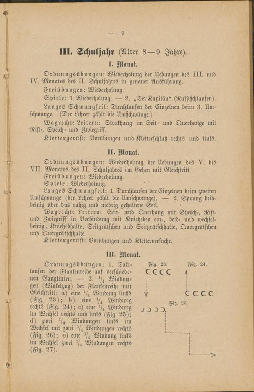 Ordnungsübungen: Wiederholung der Uebungen des III. undIV. Monates des II. Schuljahres in genauer Ausführung.Freiübungen: Wiederholung.