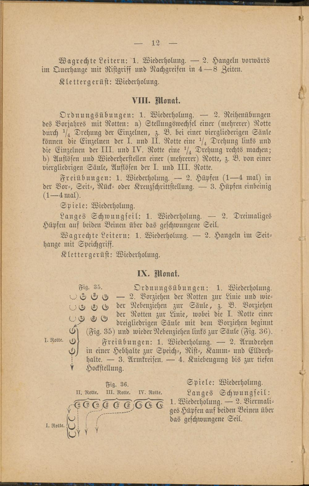Ordnungsübungen: 1. Wiederholung. — 2. Reihenübungendes Vorjahres mit Rotten: a) Stellungswechsel einer (mehrerer) Rottedurch ^ Drehung der Einzelnen, z. B. bei einer viergliederigen Säulekönnen die Einzelnen der I. und II. Rotte eine ^ Drehung links unddie Einzelnen der III. und IV. Rotte eine ^ Drehung rechts machen;d) Auslösen und Wiederherstellen einer (mehrerer) Rotte, z. B. von einerviergliedrigen Säule, Auflösen der I. und III. Rotte.
