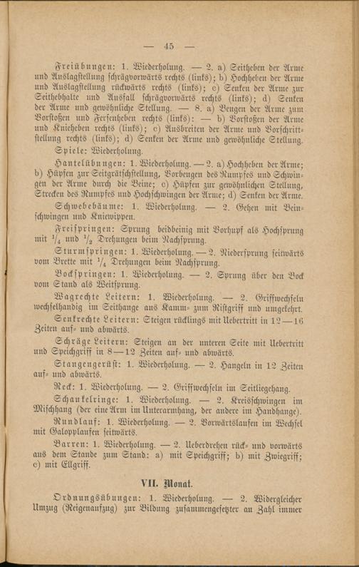 Freiübungen: 1. Wiederholung. — 2. n) Seitheben der Armeund Auslagstetlung schrägvorwärts rechts (links); k) Hochheben der Armeund Auslagstellung rückwärts rechts (links); e) Senken der Arme zurSeithcbhalte und Ausfall schrägvorwärts rechts (links); ä) Senkender Arme und gewöhnliche Stellung. — 8. n) Beugen der Arme zumBorstoßen und Fersenhcben rechts (links): — d) Vorstoßen der Armeund Knieheben rechts (links); o) Ausbreiten der Arme und Vorschritt-stellnng rechts (links); ck) Senken der Arme und gewöhnliche Stellung.