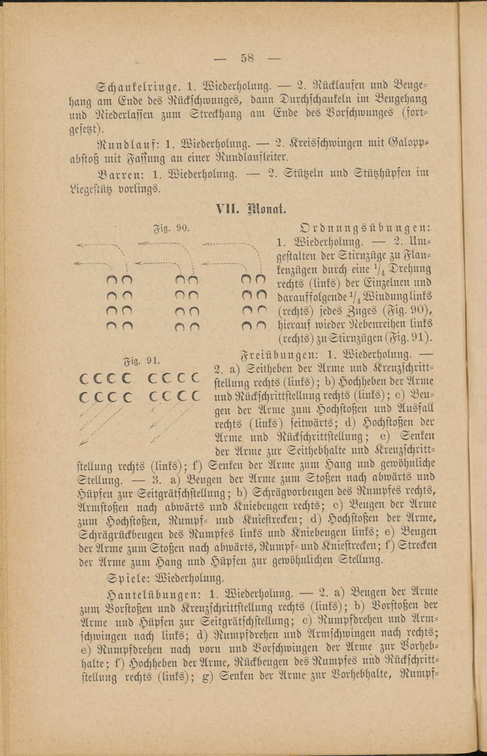 gestalten der Stirnzüge zu Flan-^ ^ kenzügen durch eine Drehung^ O r^sts (links) der Einzelnen undO ^ darauffolgende (st Windung linksO (rechts) jedes Zuges (Fig. 90),^ hierauf wieder Nebenreihen links(rechts) zu Stirnzügen (Fig. 91).Freiübungen: 1. Wiederholung. —2. a) Seithebcn der Arme und Kreuzschritt-stellung rechts (links); b) Hochheben der Armeund Nückschrittstellung rechts (links); e) Beu-gen der Arme zum Hochstoßen und Ausfallrechts (links) seitwärts; ck) Hochstoßen derArme und Rückschrittstellung; e) Senkender Arme zur Seithebhalte und Kreuzschritt-stellung rechts (links); k) Senken der Arme zum Hang und gewöhnlicheStellung. — 3. a) Beugen der Arme zum Stoßen nach abwärts undHüpfen zur Seitgrätschstellnng; d) Schrägvorbeugen des Rumpfes rechts,Armstoßen nach abwärts und Kniebeugen rechts; o) Beugen der Armezum Hochstoßen, Rumpf- und Kniestrecken; ck) Hochstoßen der Arme,Schrügrückbeugen des Rumpfes links und Kniebeugen links; e) Beugender Arme zum Stoßen nach abwärts, Rumpf-und Kniestrecken; k) Streckender Arme zum Hang und Hüpfen zur gewöhnlichen Stellung.