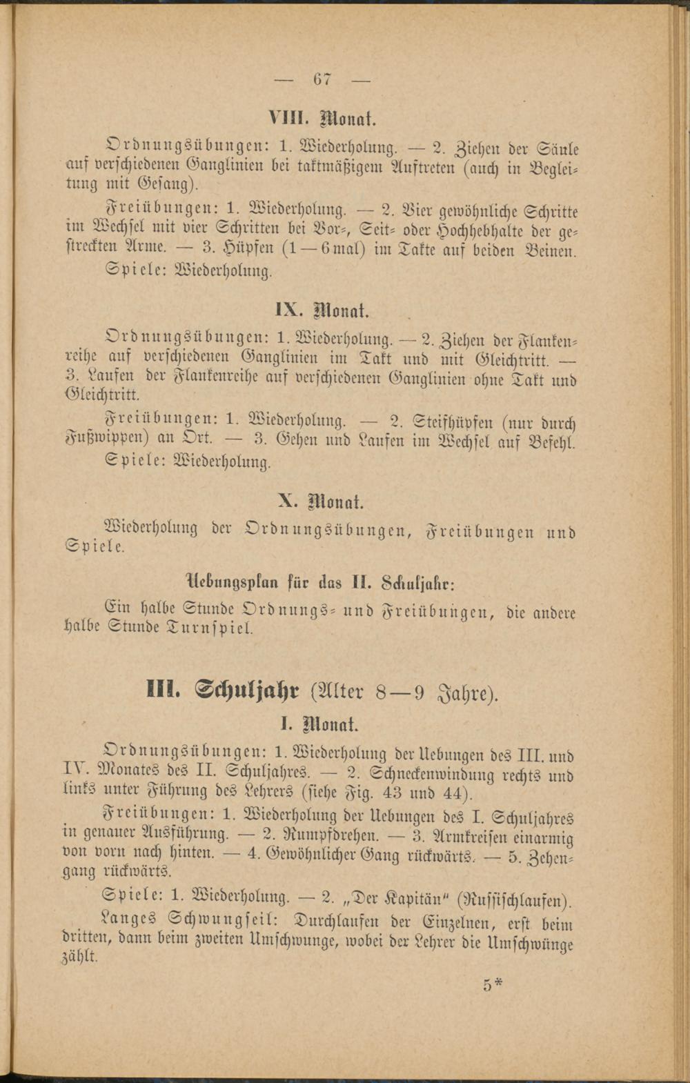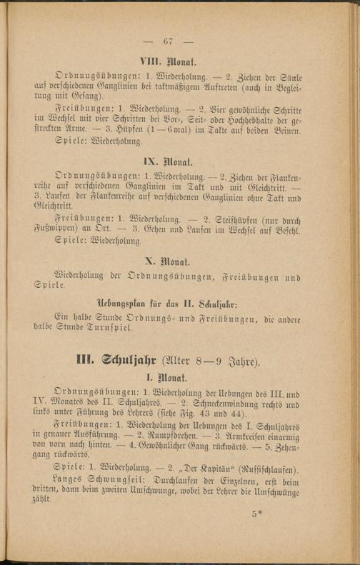 Freiübungen: 1. Wiederholung der Uebungen des I. Schuljahresin genauer Ausführung. — 2. Rumpfdrehen. — 3. Armkreisen einarmigvon vorn nach hinten. — 4. Gewöhnlicher Gang rückwärts. — 5. Zehen-gang rückwärts.