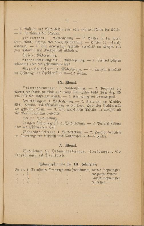Wiederholung der Ordnungsübungen, Freiübungen, Ge-räthübungen und Turnspiele.