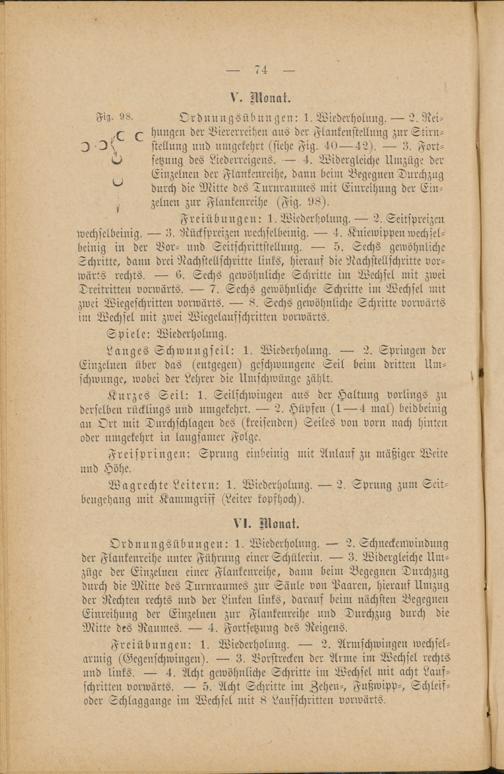 Ordnungsübungen: 1. Wiederholung. — 2. Schneckenwindungder Flankenreihe unter Führung einer Schülerin. — 3. Widergleiche Um-züge der Einzelnen einer Flankenreihe, dann beim Begegnen Durchzugdurch die Mitte des Turnraumes zur Säule von Paaren, hierauf Umzugder Rechten rechts und der Linken links, darauf beim nächsten BegegnenEinreihung der Einzelnen zur Flankenreihe und Durchzug durch dieMitte des Raumes. — 4. Fortsetzung des Reigens.