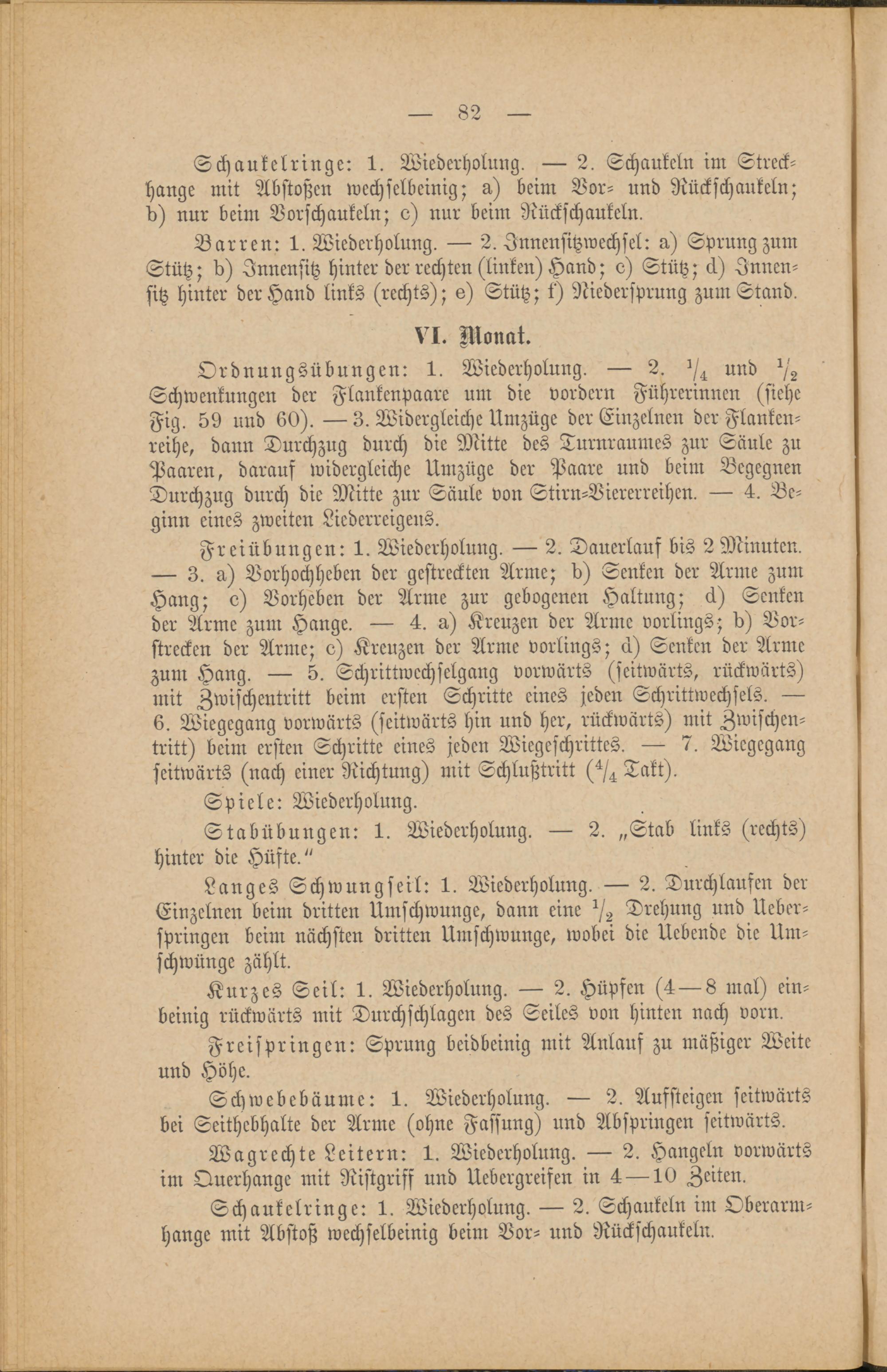 Freiübungen: 1. Wiederholung. — 2. Dauerlauf bis 2 Minuten.— 3. n) Vorhochheben der gestreckten Arme; d) Senken der Arme zumHang; e) Vorheben der Arme zur gebogenen Haltung; ä) Senkender Arme zum Hange. — 4. n) Kreuzen der Arme vorlings; 5) Vor-strecken der Arme; o) Kreuzen der Arme vorlings; ck) Senken der ArmeZum Hang. — 5. Schrittwcchselgang vorwärts (seitwärts, rückwärts)mit Zwischentritt beim ersten Schritte eines jeden Schrittwechsels. —6. Wiegegang vorwärts (seitwärts hin und her, rückwärts) mit Zwischen-tritt) beim ersten Schritte eines jeden Wiegeschrittes. — 7. Wicgegangseitwärts (nach einer Richtung) mit Schlußtritt (^ Takt).