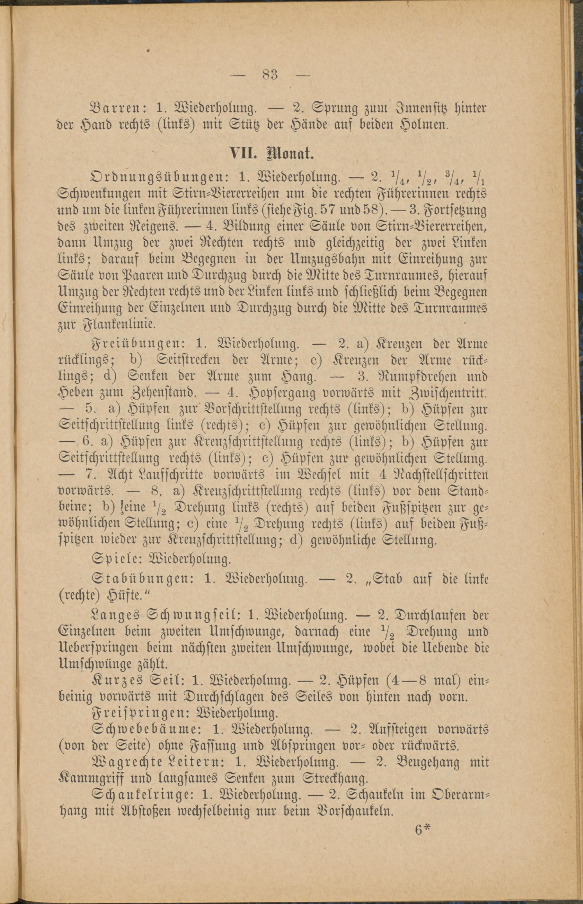 Freiübungen: 1. Wiederholung. — 2. n) Kreuzen der Armerücklings; 5) Teilstrecken der Arme; o) Kreuzen der Arme rück-lings; ck) Senken der Arme zum Hang. — 3. Rumpfdrehen undHeben zum Zehenstand. — 4. Hopsergang vorwärts mit Zwischentritt.