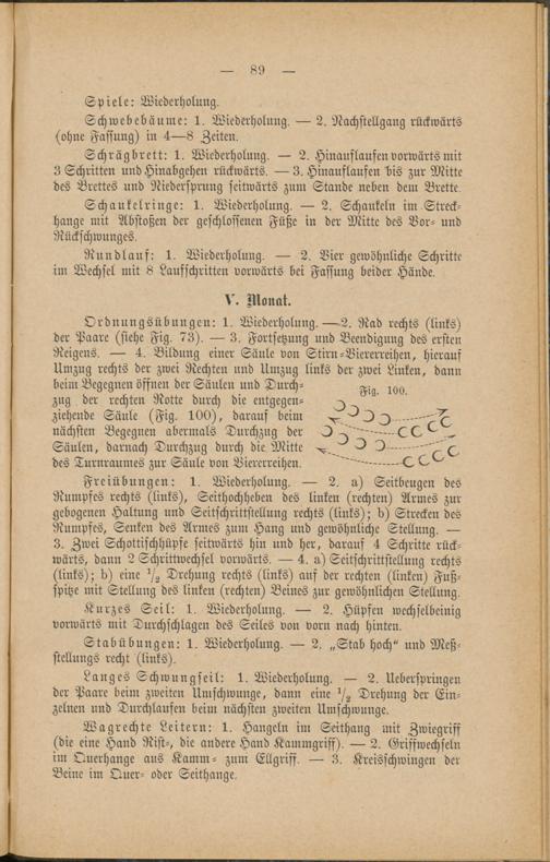Ordnungsübungen: 1. Wiederholung.—2. Rad rechts (links)der Paare (siehe Fig. 73). — 3. Fortsetzung und Beendigung des erstenReigens. — 4. Bildung einer Säule von Stirn-Viererreihen, hieraufUmzug rechts der zwei Rechten und Umzug links der zwei Linken, dann