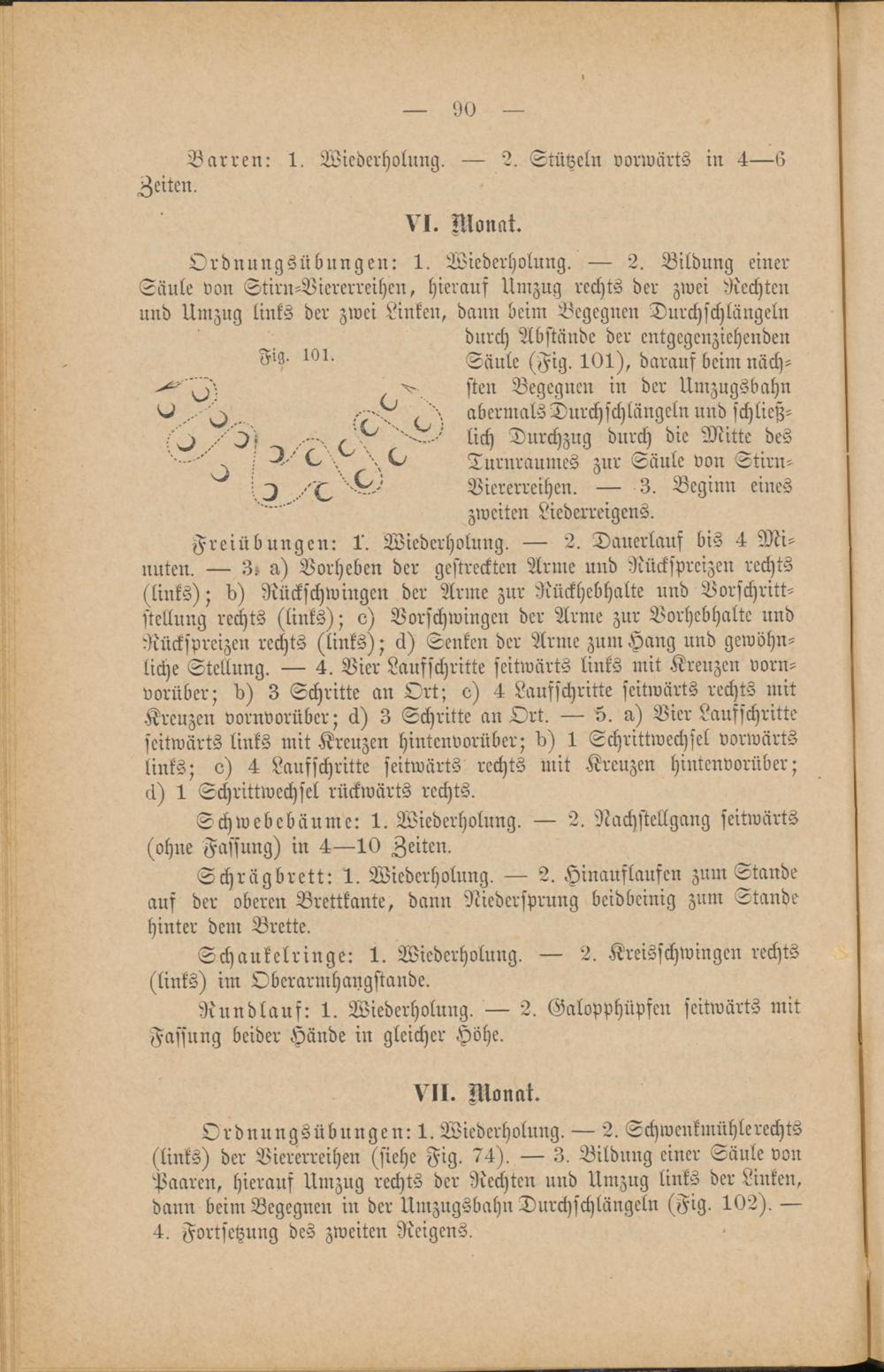 Ordnungsübungen: 1. Wiederholung. — 2. Bildung einerSäule von Stirn-Viererreihen, hierauf Umzug rechts der zwei Rechtenund Umzug links der zwei Linken, dann beim Begegnen Durchschlängeln