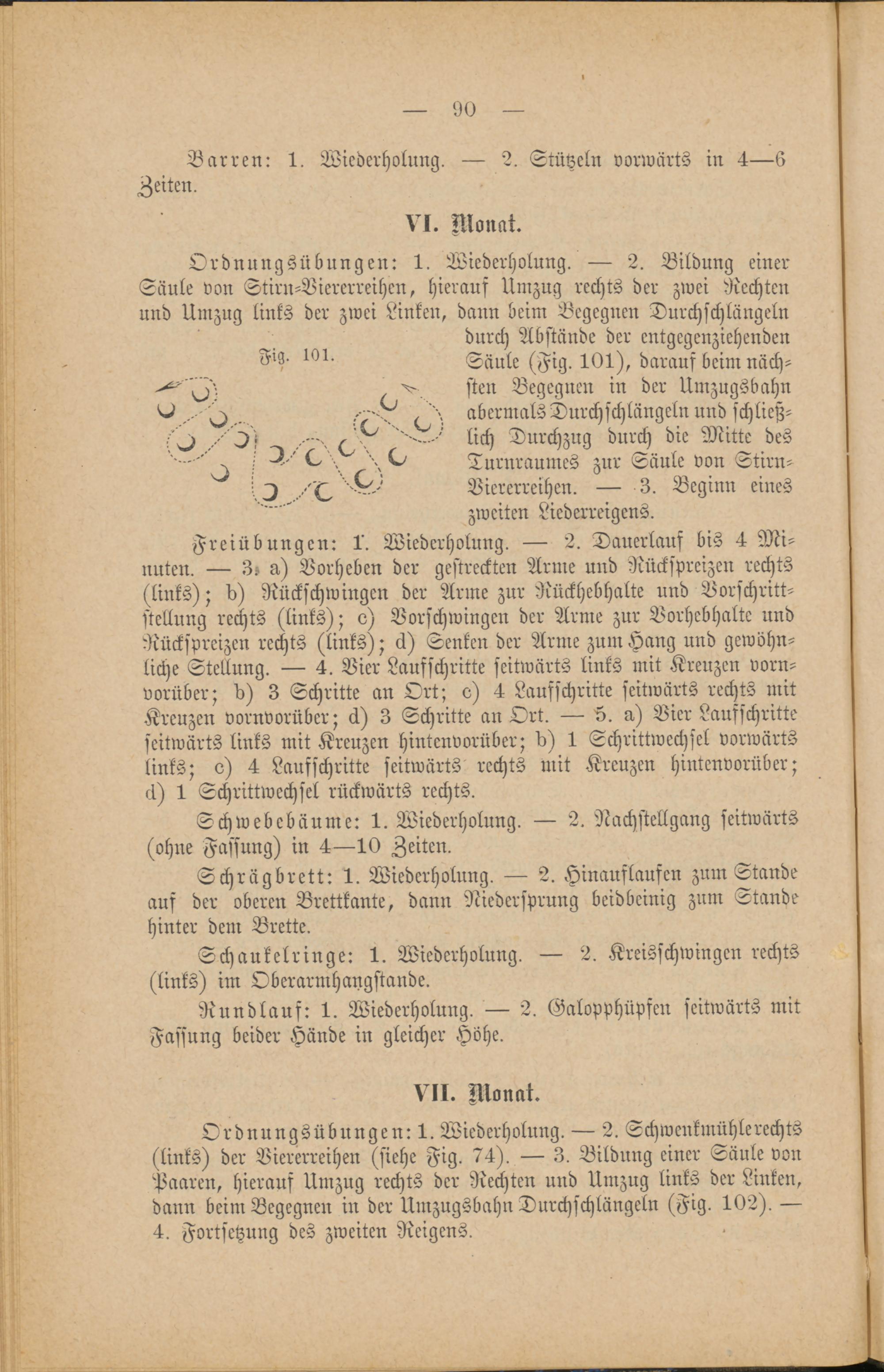 Ordnungsübungen: 1. Wiederholung. — 2. Schwenkmühlerechts(links) der Viererreihen (siehe Fig. 74). — 3. Bildung einer Säule vonPaaren, hieraus Umzug rechts der Rechten und Umzug links der Linken,dann beim Begegnen in der Umzugsbahn Durchschlängeln (Fig. 102). —4. Fortsetzung des zweiten Reigens.