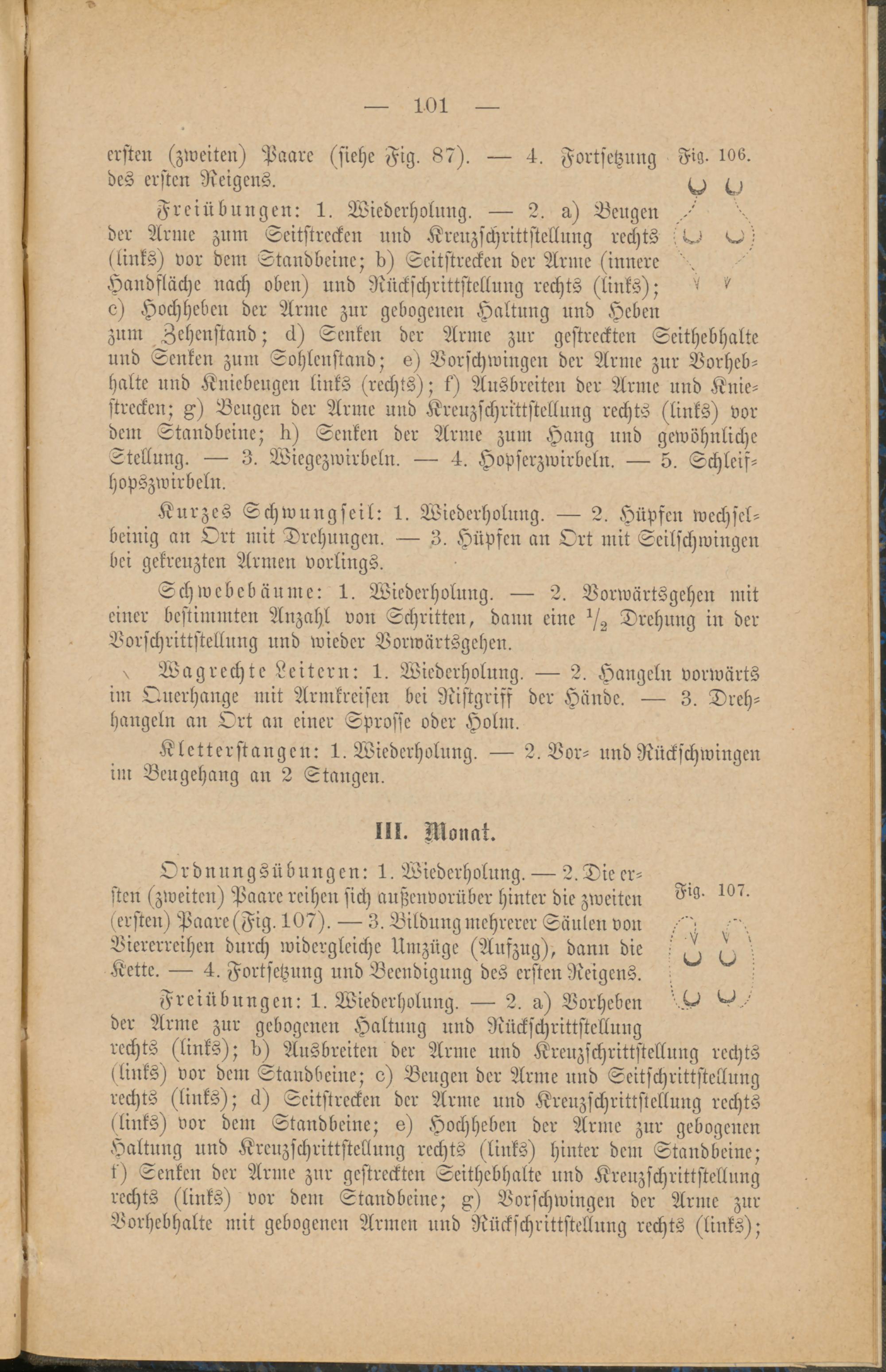 Ordnungsübungen: 1. Wiederholung. — 2. Die er-sten (zweiten) Paare reihen sich außenvorüber hinter die zweiten(ersten) Paare (Fig. 107). — 3. Bildung mehrerer Säulen vonViererreihen durch widergleiche Umzüge (Aufzug), dann dieKeile. — 4. Fortsetzung und Beendigung des ersten Reigens.