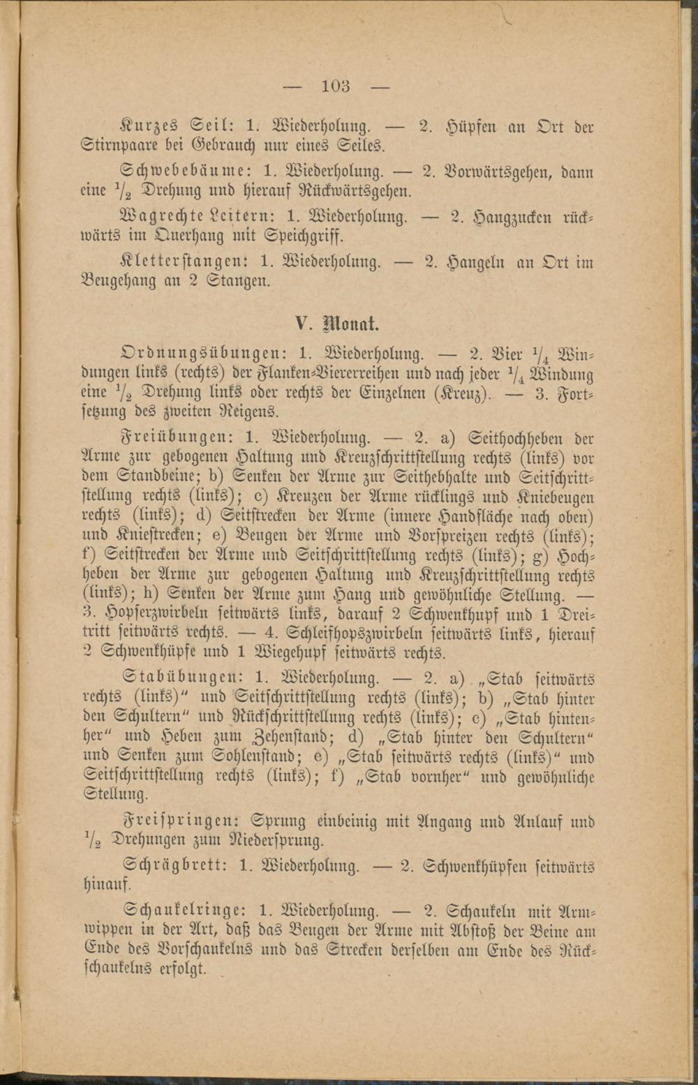 Schaukelringe: 1. Wiederholung. — 2. Schaukeln mit Arm-wippen in der Art, daß das Beugen der Arme mit Abstoß der Beine amEnde des Vorschankelns und das Strecken derselben am Ende des Nück-schaukelns erfolgt.