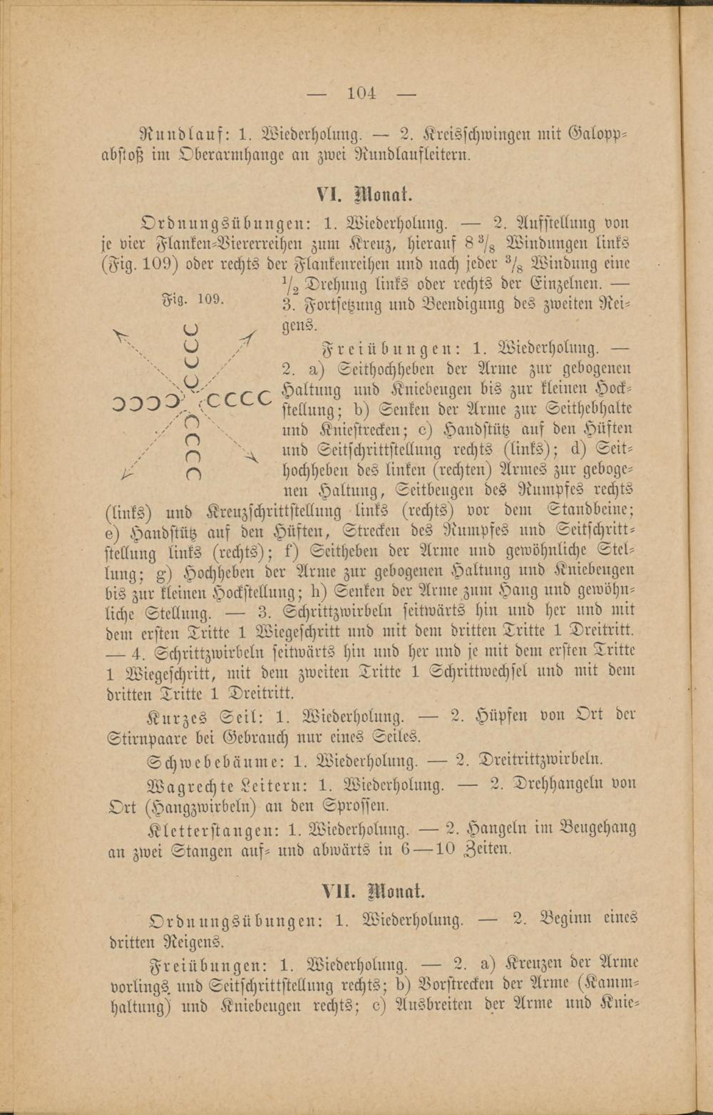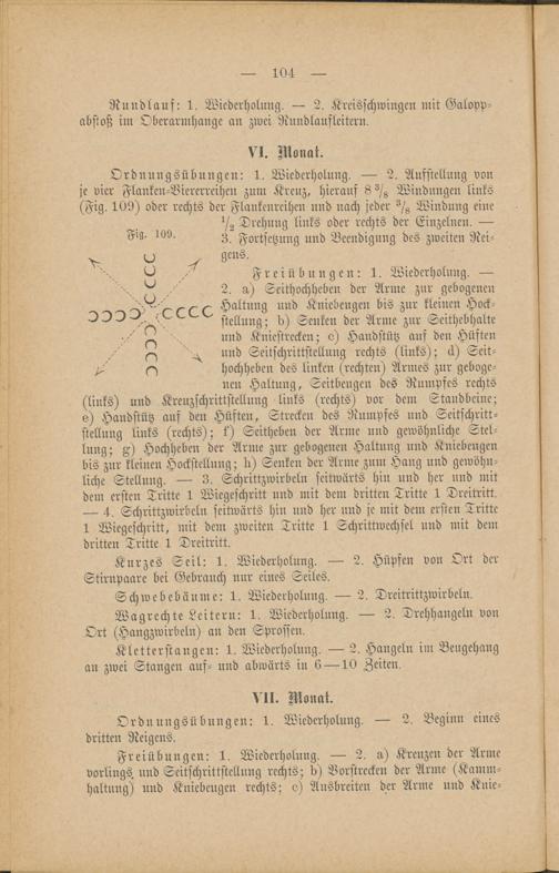 Ordnungsübungen: 1. Wiederholung. — 2. Aufstellung vonje vier Flanken-Viererreihen zum Kreuz, hierauf 8 ^ Windungen links(Fig. 109) oder rechts der Flankenrcihcn und nach jeder ^/g Windung eine^2 Drehung links oder rechts der Einzelnen. —3. Fortsetzung und Beendigung des zweiten Rei-gens.