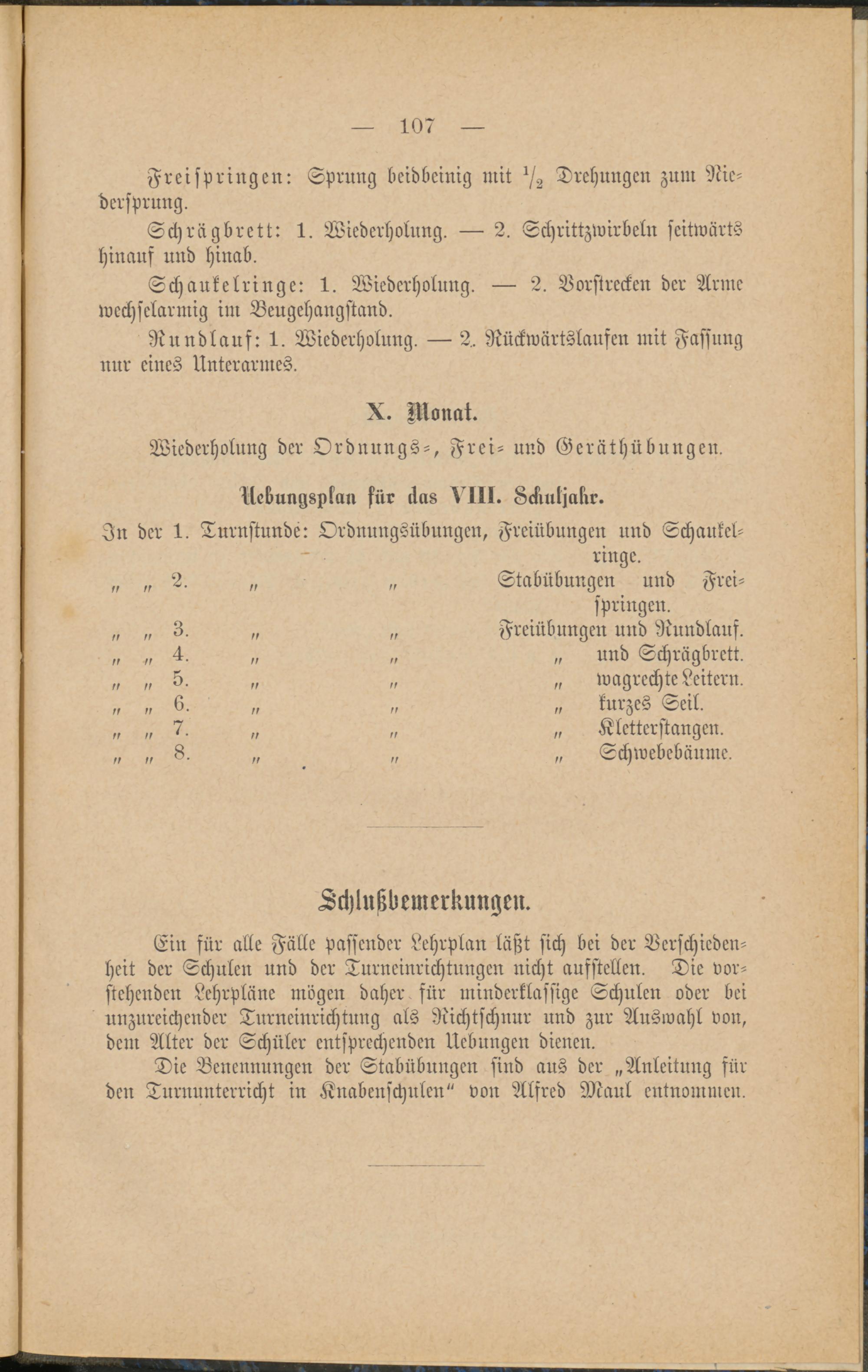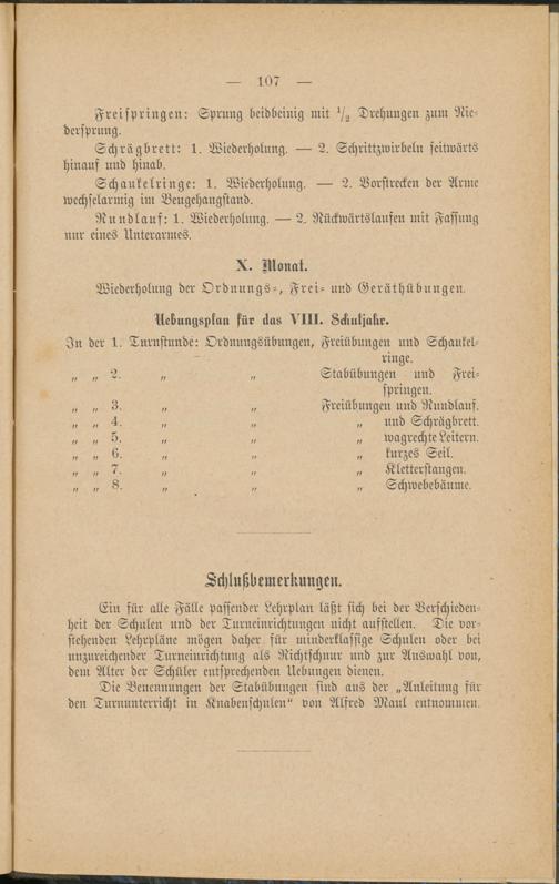 Ein für alle Fälle passender Lehrplan läßt sich bei der Verschieden-heit der Schulen und der Turneinrichtungen nicht ausstellen. Die vor-stehenden Lehrplüne mögen daher für minderklassige Schulen oder beiunzureichender Turneinrichtung als Richtschnur und zur Auswahl von,dem Alter der Schüler entsprechenden Uebungen dienen.