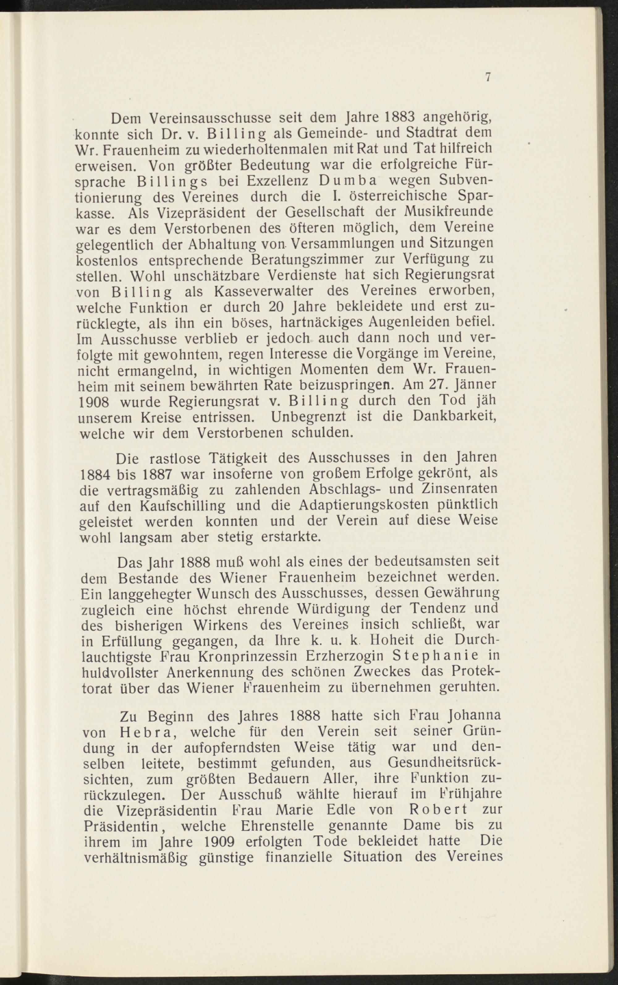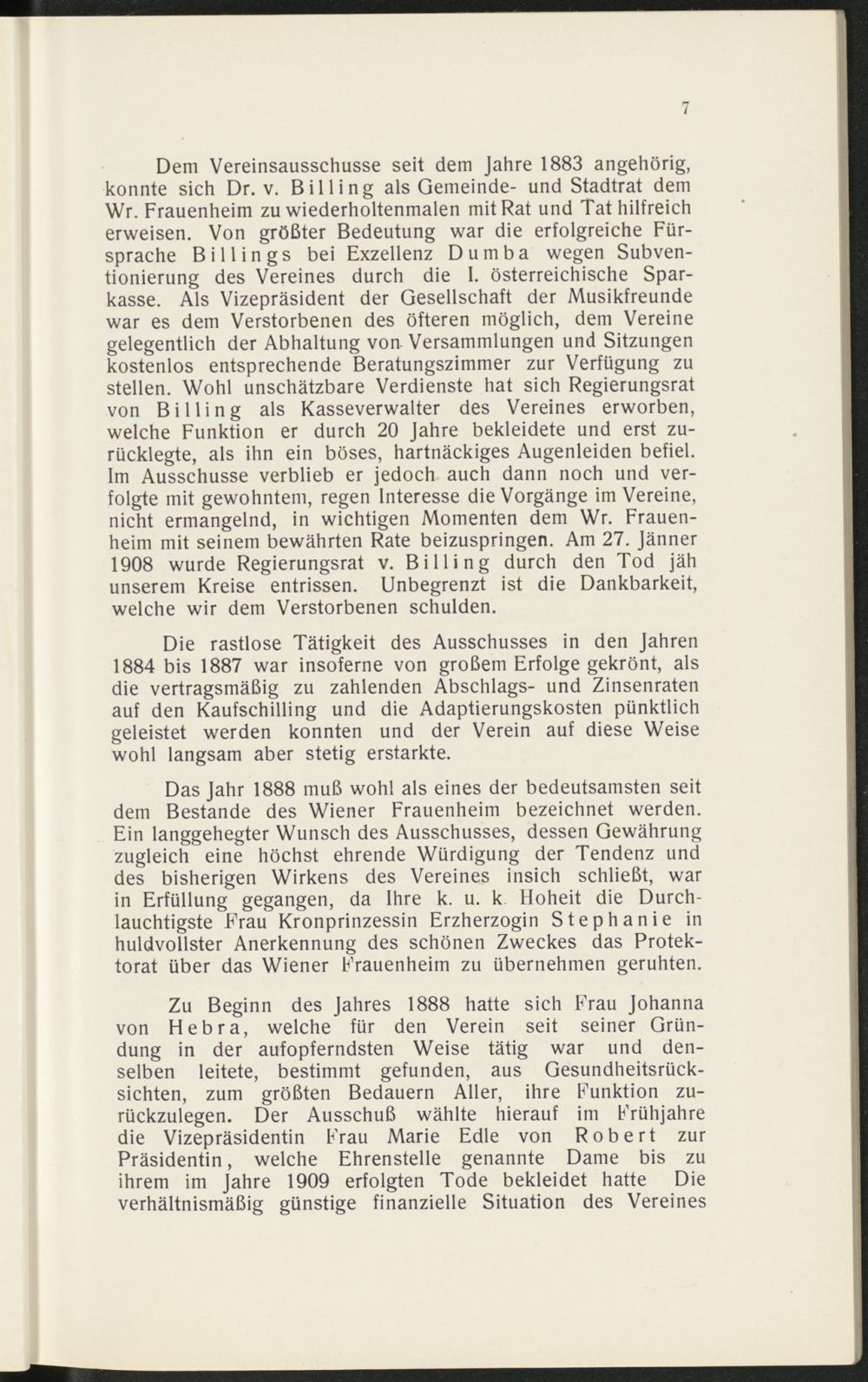 Dem Vereinsausschusse seit dem Jahre 1883 angehörig,konnte sich Dr. v. Billing als Gemeinde- und Stadtrat demWr. Frauenheim zu wiederholtenmalen mit Rat und Tat hilfreicherweisen. Von größter Bedeutung war die erfolgreiche Für-sprache Billings bei Exzellenz Dumba wegen Subven-tionierung des Vereines durch die I. österreichische Spar-kasse. Als Vizepräsident der Gesellschaft der Musikfreundewar es dem Verstorbenen des öfteren möglich, dem Vereinegelegentlich der Abhaltung von- Versammlungen und Sitzungenkostenlos entsprechende Beratungszimmer zur Verfügung zustellen. Wohl unschätzbare Verdienste hat sich Regierungsratvon Billing als Kasseverwalter des Vereines erworben,welche Funktion er durch 20 Jahre bekleidete und erst zu-rücklegte, als ihn ein böses, hartnäckiges Augenleiden befiel.Im Ausschüsse verblieb er jedoch auch dann noch und ver-folgte mit gewohntem, regen Interesse die Vorgänge im Vereine,nicht ermangelnd, in wichtigen Momenten dem Wr. Frauen-heim mit seinem bewährten Rate beizuspringen. Am 27. Jänner1908 wurde Regierungsrat v. Billing durch den Tod jähunserem Kreise entrissen. Unbegrenzt ist die Dankbarkeit,welche wir dem Verstorbenen schulden.