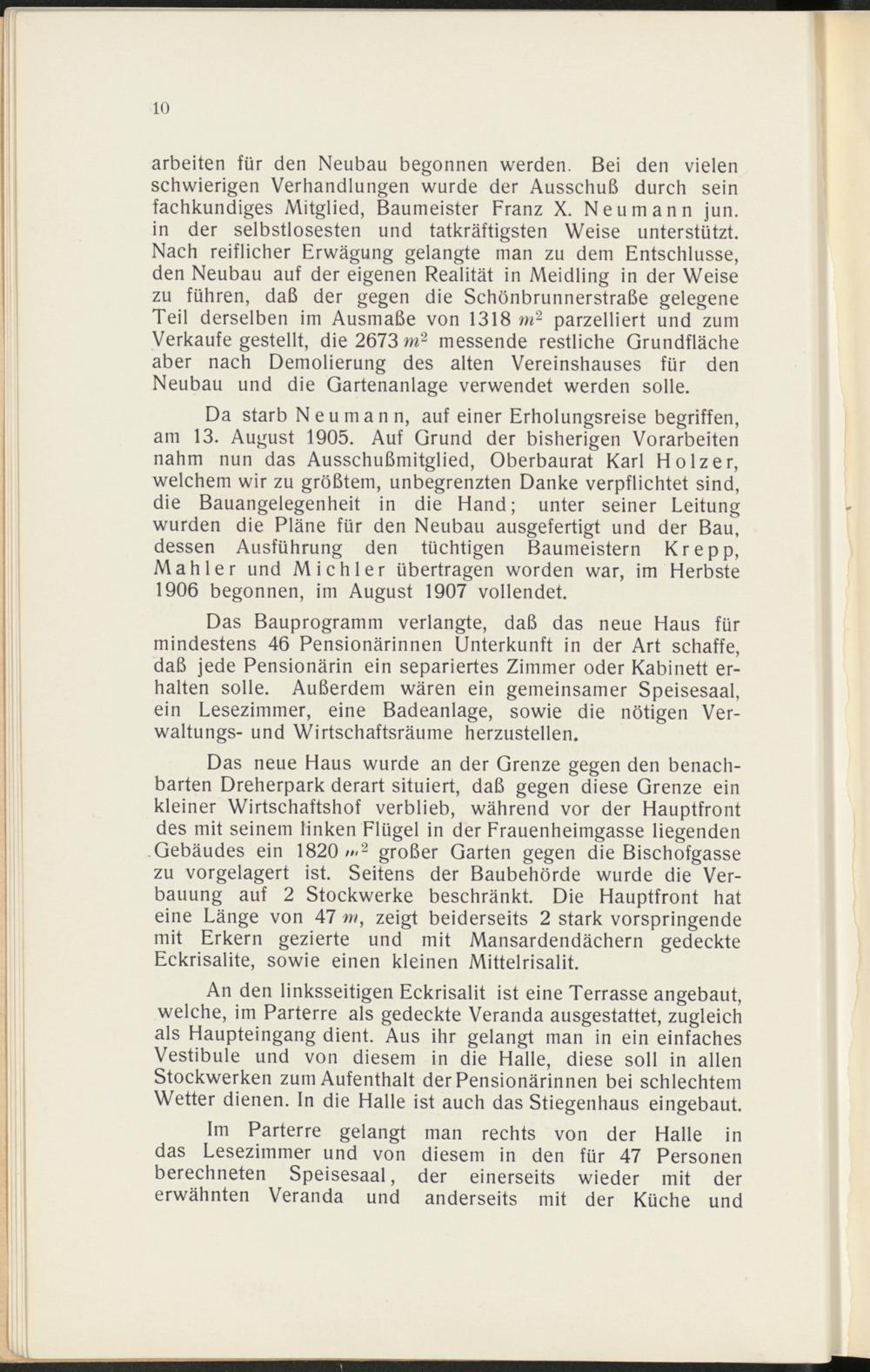 Da starb Neu mann, auf einer Erholungsreise begriffen,am 13. August 1905. Auf Grund der bisherigen Vorarbeitennahm nun das Ausschußmitglied, Oberbaurat Karl Holzer,welchem wir zu größtem, unbegrenzten Danke verpflichtet sind,die Bauangelegenheit in die Hand; unter seiner Leitungwurden die Pläne für den Neubau ausgefertigt und der Bau,dessen Ausführung den tüchtigen Baumeistern Krepp,Mahler und Mich ler übertragen worden war, im Herbste1906 begonnen, im August 1907 vollendet.