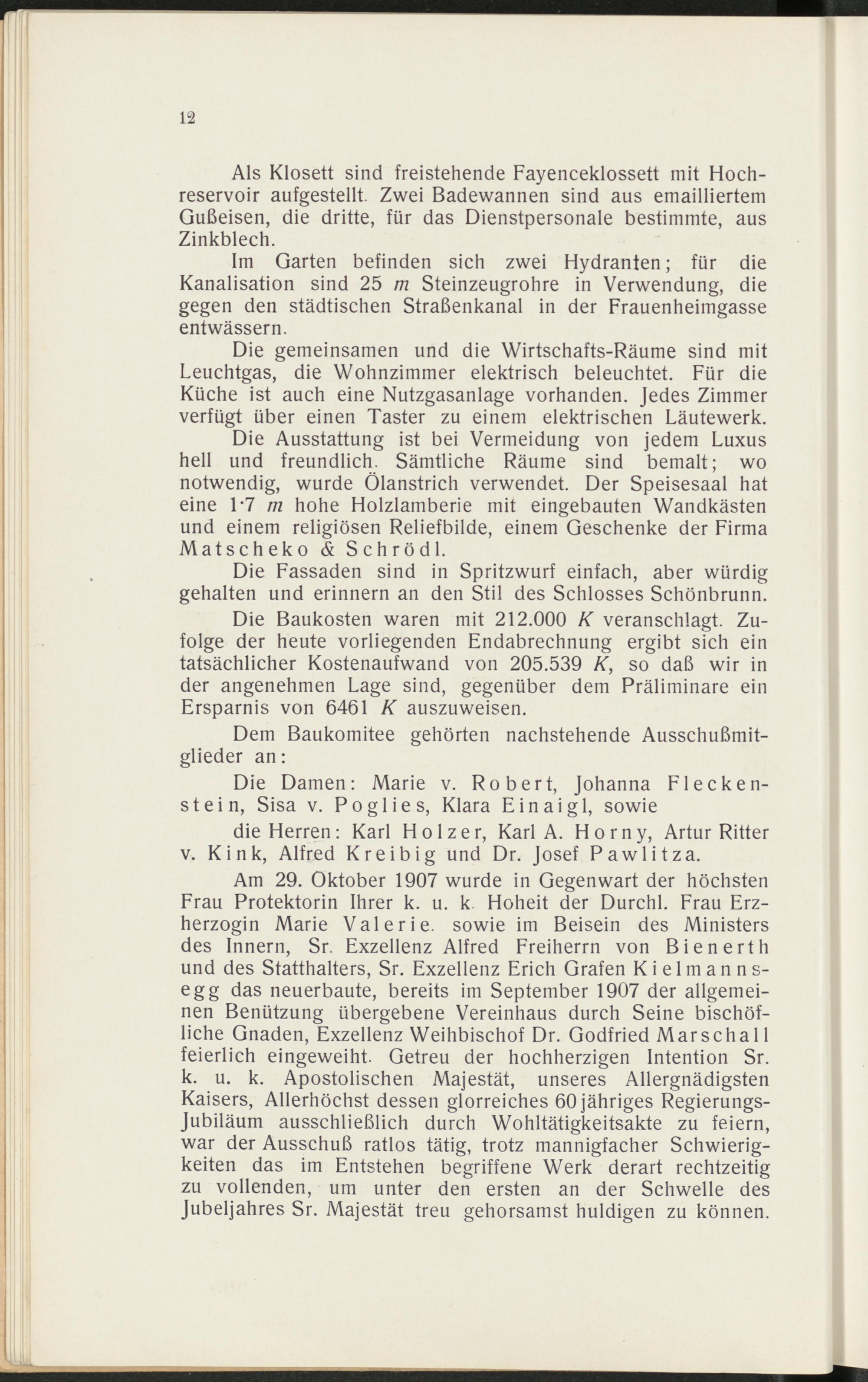 Am 29. Oktober 1907 wurde in Gegenwart der höchstenFrau Protektorin Ihrer k. u. k Hoheit der Durchl. Frau Erz-herzogin Marie Valerie, sowie im Beisein des Ministersdes Innern, Sr. Exzellenz Alfred Freiherrn von Bienerthund des Statthalters, Sr. Exzellenz Erich Grafen K i e 1 m a n n s-egg das neuerbaute, bereits im September 1907 der allgemei-nen Benützung übergebene Vereinhaus durch Seine bischöf-liche Gnaden, Exzellenz Weihbischof Dr. Godfried Marscha 11feierlich eingeweiht. Getreu der hochherzigen Intention Sr.k. u. k. Apostolischen Majestät, unseres AllergnädigstenKaisers, Allerhöchst dessen glorreiches 60 jähriges Regierungs-Jubiläum ausschließlich durch Wohltätigkeitsakte zu feiern,war der Ausschuß ratlos tätig, trotz mannigfacher Schwierig-keiten das im Entstehen begriffene Werk derart rechtzeitigzu vollenden, um unter den ersten an der Schwelle desJubeljahres Sr. Majestät treu gehorsamst huldigen zu können.