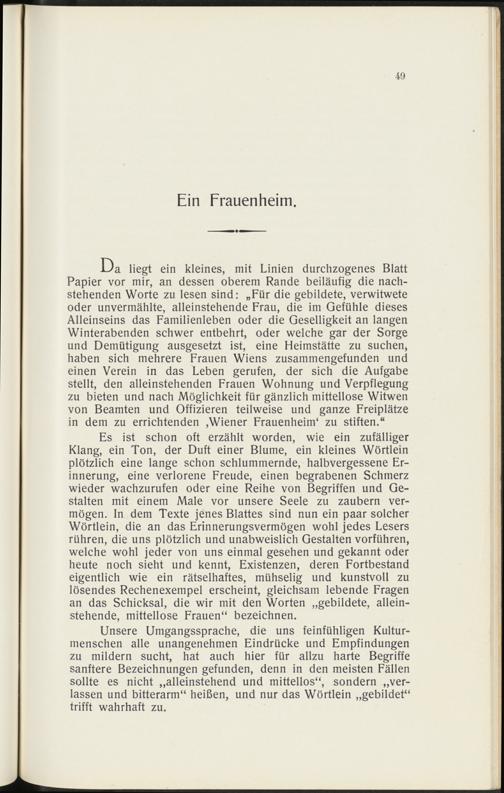 Da liegt ein kleines, mit Linien durchzogenes BlattPapier vor mir, an dessen oberem Rande beiläufig die nach-stehenden Worte zu lesen sind: „Für die gebildete, verwitweteoder unvermählte, alleinstehende Frau, die im Gefühle diesesAlleinseins das Familienleben oder die Geselligkeit an langenWinterabenden schwer entbehrt, oder welche gar der Sorgeund Demütigung ausgesetzt ist, eine Heimstätte zu suchen,haben sich mehrere Frauen Wiens zusammengefunden undeinen Verein in das Leben gerufen, der sich die Aufgabestellt, den alleinstehenden Frauen Wohnung und Verpflegungzu bieten und nach Möglichkeit für gänzlich mittellose Witwenvon Beamten und Offizieren teilweise und ganze Freiplätzein dem zu errichtenden ,Wiener Frauenheim* zu stiften.“