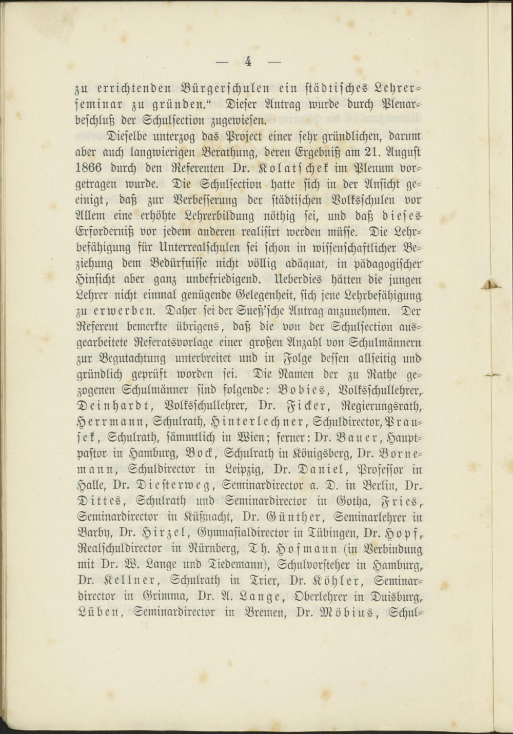 Dieselbe unterzog das Projekt einer sehr gründlichen, darumaber auch langwierigen Berathung, deren Ergebniß am 21. August1866 durch den Referenten vr. Kolatschek im Plenum vor-getragen wurde. Die Schulsection hatte sich in der Ansicht ge-einigt, daß zur Verbesserung der städtischen Volksschulen vorAllem eine erhöhte Lehrerbildung nöthig sei, und daß diesesErforderniß vor jedem anderen realisirt werden müsse. Die Lehr-befähigung sür Unterrealschulen sei schon in wissenschaftlicher Be-ziehung dem Bedürfnisse nicht völlig adäquat, in pädagogischerHinsicht aber ganz unbefriedigend. Ueberdies hätten die jungenLehrer nicht einmal genügende Gelegenheit, sich jene Lehrbefähigungzu erwerben. Daher sei der Sueß'sche Antrag anzunehmen. DerReferent bemerkte übrigens, daß die von der Schulsection aus-gearbeitete Reseratsvorlage einer großen Anzahl von Schulmännernzur Begutachtung unterbreitet und in Folge dessen allseitig undgründlich geprüft worden sei. Die Namen der zu Rathe ge-zogenen Schulmänner sind folgende: Bobies, Volksschullehrer^Deinhardt, Volksschullehrer, Dr. Ficker, Regierungsrath,Herrmann, Schulrath, Hinterlechner, Schuldirector, Pra u-sek, Schulrath, sämmtlich in Wien; ferner: vr. B a n e r, Haupt-pastor in Hamburg, Bock, Schulrath in Königsberg, vr. Borne-mann, Schuldirector in Leipzig, vr. Daniel, Professor inHalle, vr. Diesterweg, Seminardirector a. D. in Berlin, vr.Dittes, Schulrath und Seminardirector in Gotha, Fries,Seminardirector in Küßnacht, vr. Günther, Seminarlehrer inBarby, vr. Hirzel, Gymnasialdirector in Tübingen, vr. Hopf,Realschuldirector in Nürnberg, Th. Hofmann (in Verbindungmit vr. W. Lange und Tiedemann), Schulvorsteher in Hamburg,vr. Kellner, Schulrath in Trier, vr. Köhler, Seminar-director in Grimma, vr. A. Lange, Oberlehrer in Duisburg,Lüben, Seminardirector in Bremen, vr. Möbius, Schul-