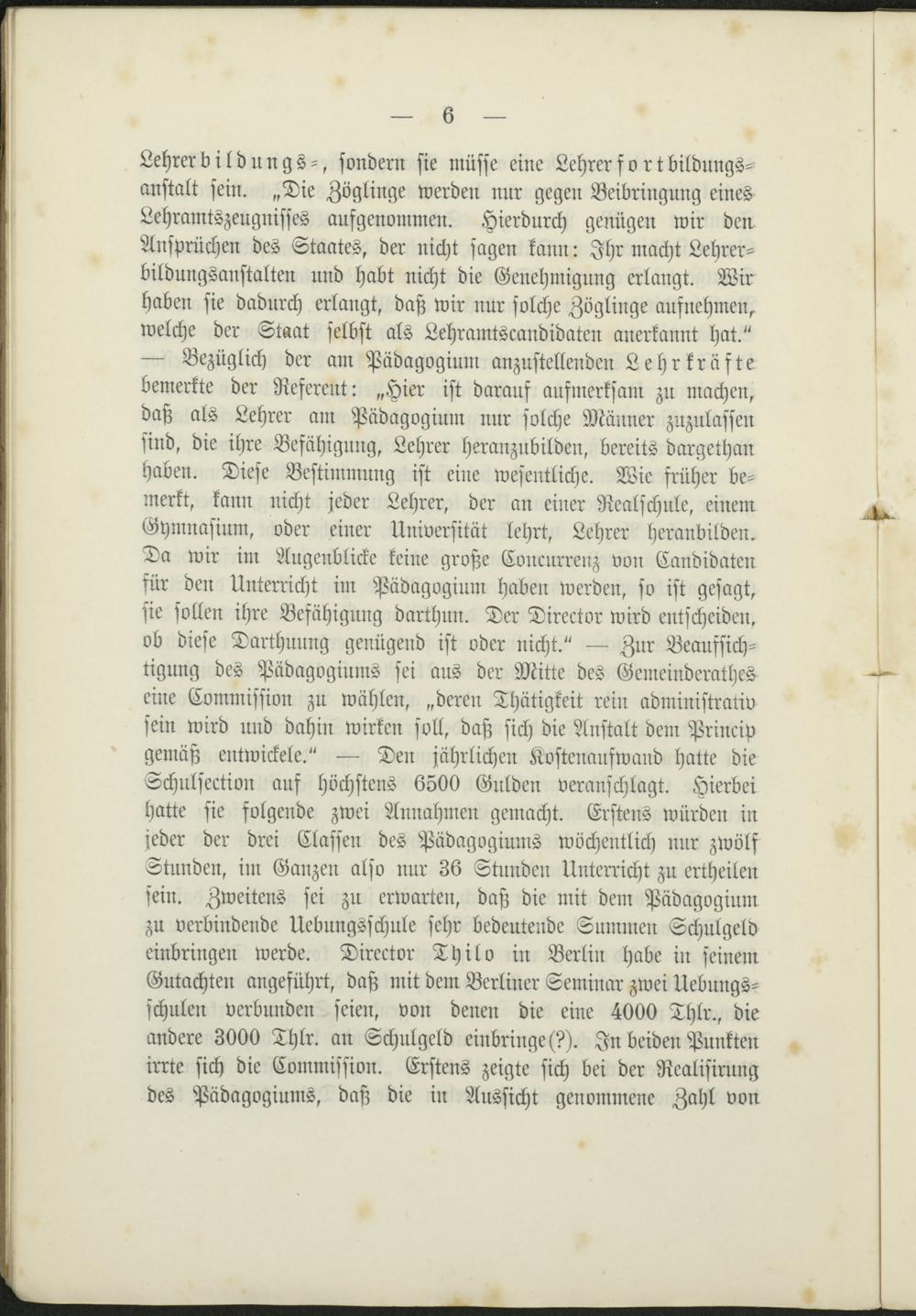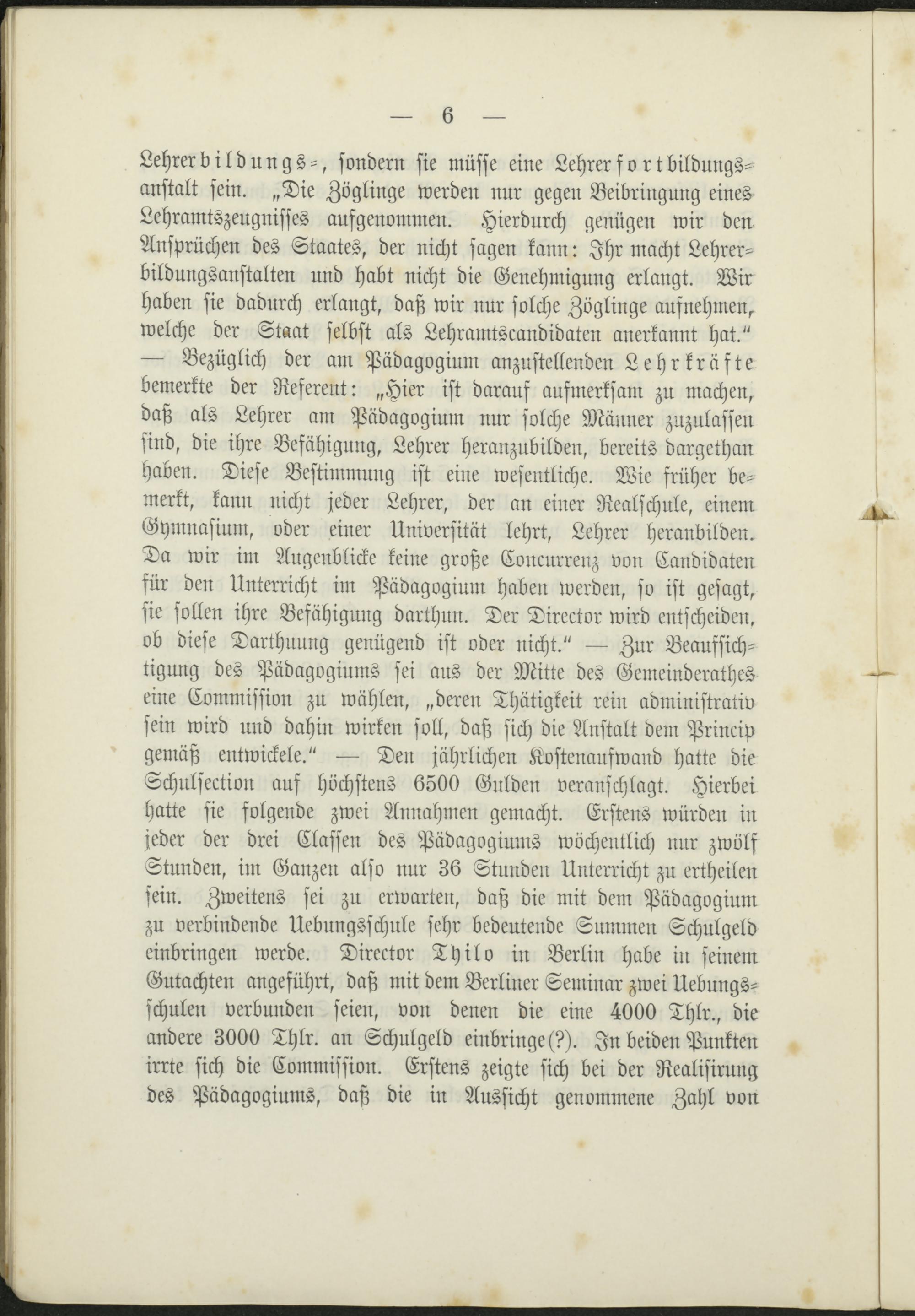 Lehrerb ildungs-, sondern sie müsse eine Lehrer f o r t bildungs-anstalt sein. „Die Zöglinge werden nur gegen Beibringung einesLehramtszeugnisses aufgenommen. Hierdurch genügen wir denAnsprüchen des Staates, der nicht sagen kann: Ihr macht Lehrer-bildungsanstalten und habt nicht die Genehmigung erlangt. Wirhaben sie dadurch erlangt, daß wir nur solche Zöglinge aufnehmen,welche der Staat selbst als Lehramtskandidaten anerkannt hat."— Bezüglich der am Pädagogium anzustellenden Lehrkräftebemerkte der Referent: „Hier ist daraus aufmerksam zu machen,daß als Lehrer am Pädagogium nur solche Männer zuzulassensind, die ihre Befähigung, Lehrer heranzubilden, bereits dargethanhaben. Diese Bestimmung ist eine wesentliche. Wie früher be-merkt, kann nicht jeder Lehrer, der an einer Realschule, einemGymnasium, oder einer Universität lehrt, Lehrer heranbilden.Da wir im Augenblicke keine große Concurrenz von Candidatenfür den Unterricht im Pädagogium haben werden, so ist gesagt,sie sollen ihre Befähigung darthun. Der Director wird entscheiden,ob diese Darthuung genügend ist oder nicht." — Zur Beaufsich-tigung des Pädagogiums sei aus der Mitte des Gemeinderatheseine Commission zu wählen, „deren Thätigkeit rein administrativsein wird und dahin wirken soll, daß sich die Anstalt dem Principgemäß entwickele." — Den jährlichen Kostenaufwand hatte dieSchnlsection aus höchstens 6500 Gulden veranschlagt. Hierbeihatte sie folgende zwei Annahmen gemacht. Erstens würden injeder der drei Classen des Pädagogiums wöchentlich nur zwölfStunden, im Ganzen also nur 36 Stunden Unterricht zu ertheilensein. Zweitens sei zu erwarten, daß die mit dem Pädagogiumzu verbindende Uebungsschule sehr bedeutende Summen Schulgeldeinbringen werde. Director Thilo in Berlin habe in seinemGutachten angeführt, daß mit dem Berliner Seminar zwei Uebungs-schulen verbunden seien, von denen die eine 4000 Thlr., dieandere 3000 Thlr. an Schulgeld einbringe(?). In beiden Punktenirrte sich die Commission. Erstens zeigte sich bei der Realisirungdes Pädagogiums, daß die in Aussicht genommene Zahl von