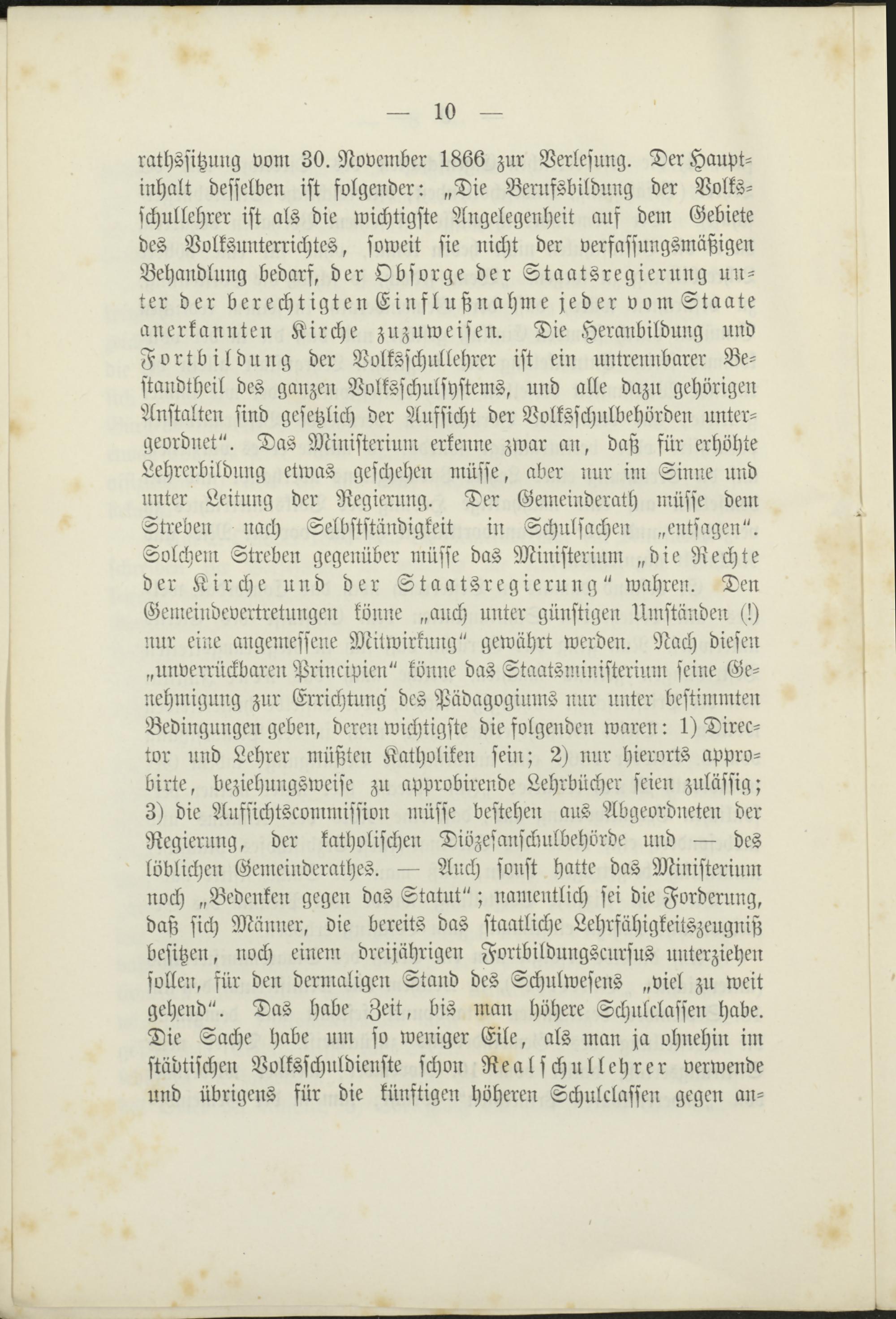 rathssitzung von: 30. November 1866 zur Verlesung. Der Haupt-inhalt desselben ist folgender: „Die Berufsbildung der Volks-schullehrer ist als die wichtigste Angelegenheit aus dem Gebietedes Volksunterrichtes, soweit sie nicht der verfassungsmäßigenBehandlung bedarf, der Obsorge der Staatsregierung un-ter der berechtigten Einflußnahme jeder von: Staateanerkannten Kirche zuzuweisen. Die Heranbildung undFortbildung der Volksschullehrer ist ein untrennbarer Be-standtheil des ganzen Volksschulsystems, und alle dazu gehörigenAnstalten sind gesetzlich der Aufsicht der Volksschulbehörden unter-geordnet". Das Ministerinn: erkenne zwar an, daß für erhöhteLehrerbildung etwas geschehen müsse, aber nur in: Sinne undunter Leitung der Regierung. Der Gemeinderath müsse demStreben nach Selbstständigkeit in Schulsachen „entsagen".Solchen: Streben gegenüber müsse das Ministerium „die Rechteder Kirche und der Staatsregierung" wahren. DenGemeindevertretungen könne „auch unter günstigen Umstünden (!)nur eine angemessene Mitwirkung" gewährt werden. Nach diesen„unverrückbaren Principien" könne das Staatsministerium seine Ge-nehmigung zur Errichtung des Pädagogiums nur unter bestimmtenBedingungen geben, deren wichtigste die folgenden waren: 1) Direc-tor und Lehrer müßten Katholiken sein; 2) nur hierorts appro-birte, beziehungsweise zu approbirende Lehrbücher seien zulässig;3) die Aufsichtscommission müsse bestehen aus Abgeordneten derRegierung, der katholischen Diözesansckmlbehörde und — deslöblichen Gemeinderathes. — Auch sonst hatte das Ministeriumnoch „Bedenken gegen das Statut"; namentlich sei die Forderung,daß sich Männer, die bereits das staatliche Lehrfühigkeitszeugnißbesitzen, noch einen: dreijährigen Fortbildungscursus unterziehensollen, für den dermaligen Stand des Schulwesens „viel zu weitgehend". Das habe Zeit, bis man höhere Schutclassen habe.Die Sache habe um so weniger Eile, als man ja ohnehin in:städtischen Volksschuldienste schon Realschullehrer verwendeund übrigens für die künftigen höheren Schulclassen gegen an-