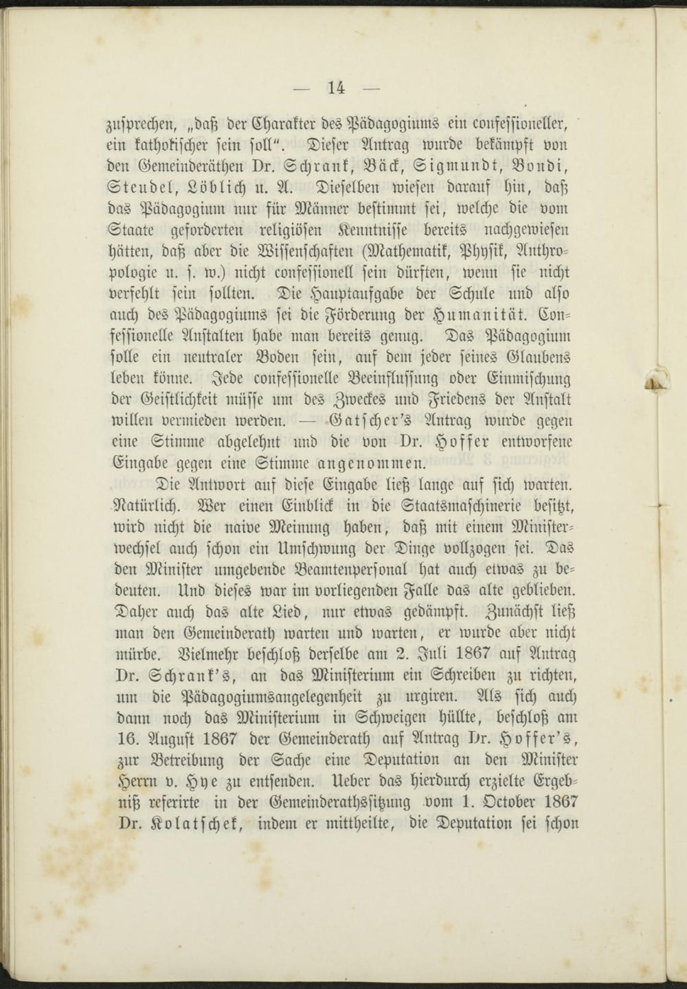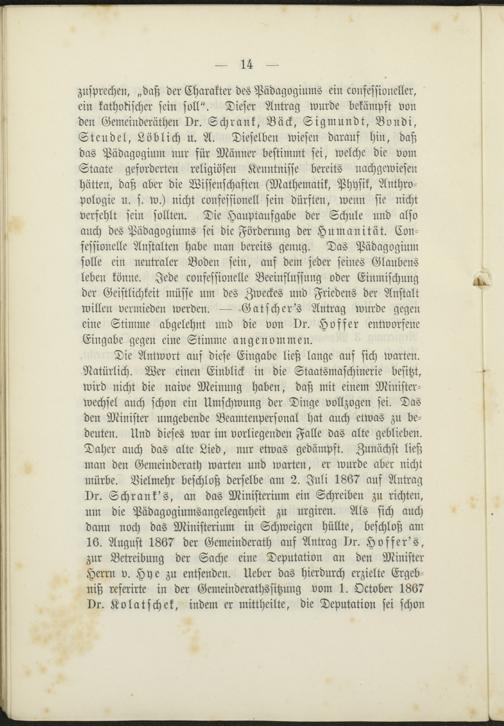 Die Antwort auf diese Eingabe ließ lange auf sich warten.Natürlich. Wer einen Einblick in die Staatsmaschinerie besitzt,wird nicht die naive Meinung haben, daß mit einem Minister-wechsel auch schon ein Umschwung der Dinge vollzogen sei. Dasden Minister umgebende Beamtenpersonal hat auch etwas zu be-deuten. Und dieses war im vorliegenden Falle das alte geblieben.Daher auch das alte Lied, nur etwas gedämpft. Zunächst ließman den Gemeinderath warten und warten, er wurde aber nichtmürbe. Vielmehr beschloß derselbe am 2. Juli 1867 auf AntragDr. Schrank's, an das Ministerium ein Schreiben zu richten,um die Pädagogiumsangelegenheit zu urgiren. Als sich auchdann noch das Ministerium in Schweigen hüllte, beschloß am16. August 1867 der Gemeinderath auf Antrag Dr. Hoffer's,zur Betreibung der Sache eine Deputation an den MinisterHerrn v. Hye zu entsenden. Ueber das hierdurch erzielte Ergeb-niß referirte in der Gemeinderathssitzung vom 1. October 1867Dr. Kolatschek, indem er mittheilte, die Deputation sei schon