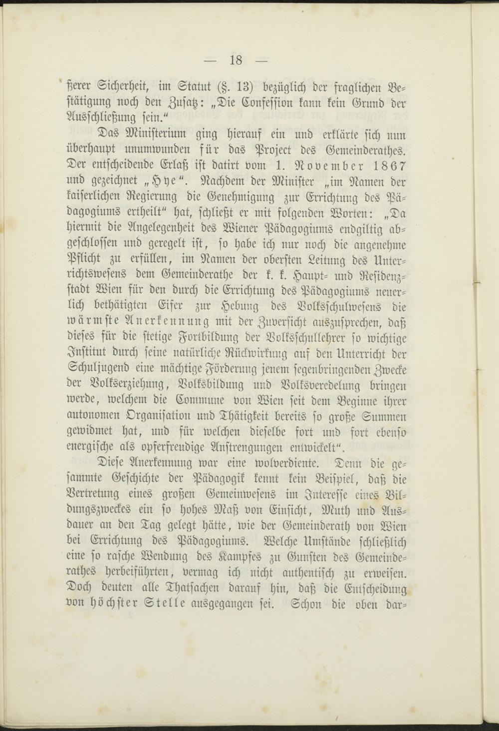 Das Ministerium ging hierauf ein und erklärte sich nunüberhaupt unumwunden für das Project des Gemeinderathes.Der entscheidende Erlaß ist datirt vom 1. November 1867und gezeichnetHye". Nachdem der Ministerim Namen derkaiserlichen Regierung die Genehmigung zur Errichtung des Pä-dagogiums ertheilt" hat, schließt er mit folgenden Worten:Dahiermit die Angelegenheit des Wiener Pädagogiums endgiltig ab-geschlossen und geregelt ist, so habe ich nur noch die angenehmePflicht zu erfüllen, im Namen der obersten Leitung des Unter-richtswesens dem Gemeinderathe der k. k. Haupt- und Residenz-stadt Wien für den durch die Errichtung des Pädagogiums neuer-lich bethätigten Eifer zur Hebung des Volksschulwesens diewärmste Anerkennung mit der Zuversicht auszusprechen, daßdieses für die stetige Fortbildung der Volksschullehrer so wichtigeInstitut durch seine natürliche Rückwirkung auf den Unterricht derSchuljugend eine mächtige Förderung jenem segenbringenden Zweckeder Volkserziehung, Volksbildung und Volksveredelung bringenwerde, welchem die Commune von Wien seit dem Beginne ihrerautonomen Organisation und Thätigkeit bereits so große Summengewidmet hat, und für welchen dieselbe fort und fort ebensoenergische als opferfreudige Anstrengungen entwickelt".