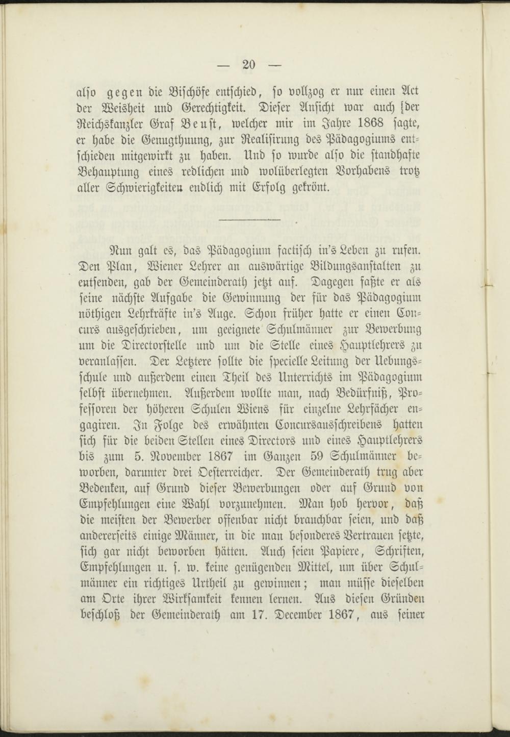 also gegen die Bischöfe entschied, so vollzog er nur einen Actder Weisheit und Gerechtigkeit. Dieser Ansicht war auch sderReichskanzler Graf Beust, welcher mir im Jahre 1868 sagte,er habe die Genugthuung, zur Realisirung des Pädagogiums ent-schieden mitgewirkt zu haben. Und so wurde also die standhafteBehauptung eines redlichen und wolüberlegten Vorhabens trotzaller Schwierigkeiten endlich mit Erfolg gekrönt.