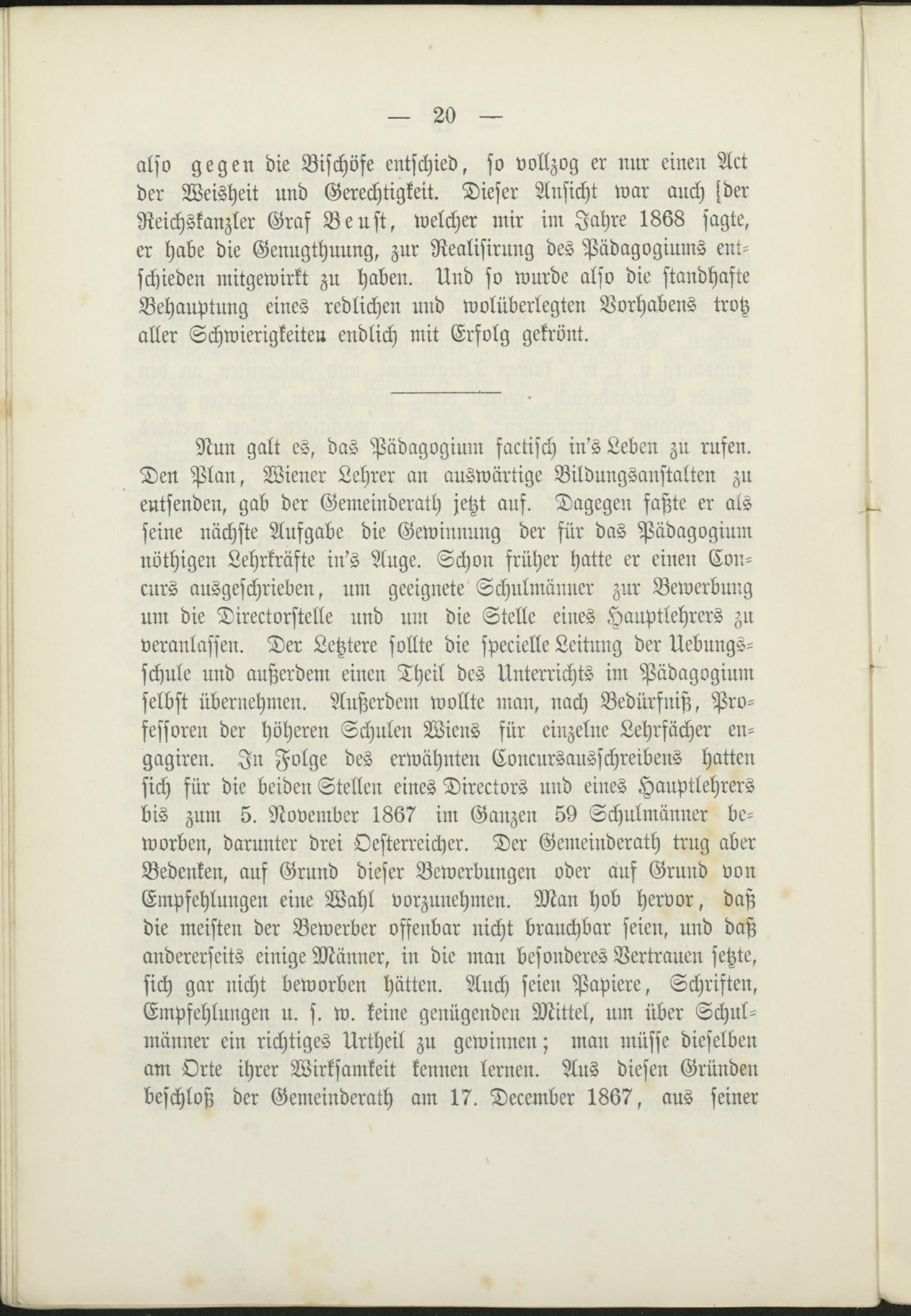Nun galt es, das Pädagogium factisch in's Leben zu rufen.Den Plan, Wiener Lehrer an auswärtige Bildungsanstalten zuentsenden, gab der Gemeinderath jetzt auf. Dagegen faßte er alsseine nächste Aufgabe die Gewinnung der für das Pädagogiumnöthigen Lehrkräfte in's Auge. Schon früher hatte er einen Con-curs ausgeschrieben, um geeignete Schulmänner zur Bewerbungum die Directorstelle und um die Stelle eines Hauptlehrers zuveranlassen. Der Letztere sollte die specielle Leitung der Uebungs-schule und außerdem einen Theil des Unterrichts im Pädagogiumselbst übernehmen. Außerdem wollte man, nach Bedürfniß, Pro-fessoren der höheren Schulen Wiens für einzelne Lehrfächer en-gagiren. In Folge des erwähnten Concursausschreibens hattensich für die beiden Stellen eines Directors und eines Hauptlehrersbis zum 5. November 1867 im Ganzen 59 Schulmänner be-worben, darunter drei Österreicher. Der Gemeinderath trug aberBedenken, auf Grund dieser Bewerbungen oder auf Grund vonEmpfehlungen eine Wahl vorzunehmen. Man hob hervor, daßdie meisten der Bewerber offenbar nicht brauchbar seien, und daßandererseits einige Männer, in die man besonderes Vertrauen setzte,sich gar nicht beworben hätten. Auch seien Papiere, Schriften,Empfehlungen u. s. w. keine genügenden Mittel, um über Schul-männer ein richtiges Urtheil zu gewinnen; man müsse dieselbenam Orte ihrer Wirksamkeit kennen lernen. Aus diesen Gründenbeschloß der Gemeinderath am 17. December 1867, aus seiner