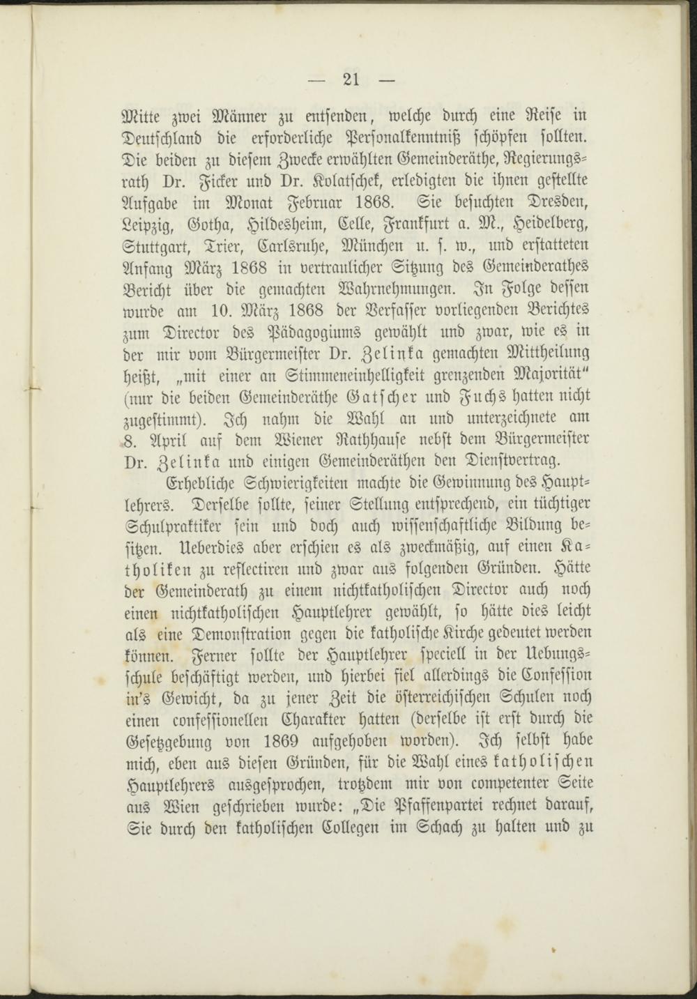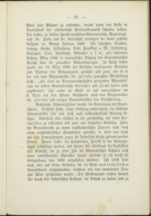 Mitte zwei Männer zu entsenden, welche durch eine Reise inDeutschland die erforderliche Personalkenntniß schöpfen sollten.Die beiden zu diesem Zwecke erwählten Gemeinderäthe, Regierungs-rath vr. Ficker und Dr. Kolatschek, erledigten die ihnen gestellteAufgabe im Monat Februar 1868. Sie besuchten Dresden,Leipzig, Gotha, Hildesheim, Celle, Frankfurt a. M., Heidelberg,Stuttgart, Trier, Carlsruhe, München u. s. w., und erstattetenAnfang März 1868 in vertraulicher Sitzung des GemeinderathesBericht über die gemachten Wahrnehmungen. In Folge dessenwurde am 10. März 1868 der Verfasser vorliegenden Berichteszum Director des Pädagogiums gewählt und zwar, wie es inder mir vom Bürgermeister Dr. Zelinka gemachten Mittheilungheißt, „mit einer an Stimmeneinhelligkeit grenzenden Majorität"(nur die beiden Gemeinderäthe Gätsch er und Fuchs hatten nichtzugestimmt). Ich nahm die Wahl an und unterzeichnete am8. April auf dem Wiener Rathhause nebst dem BürgermeisterDr. Zelinka und einigen Gemeinderäthen den Dienstvertrag.