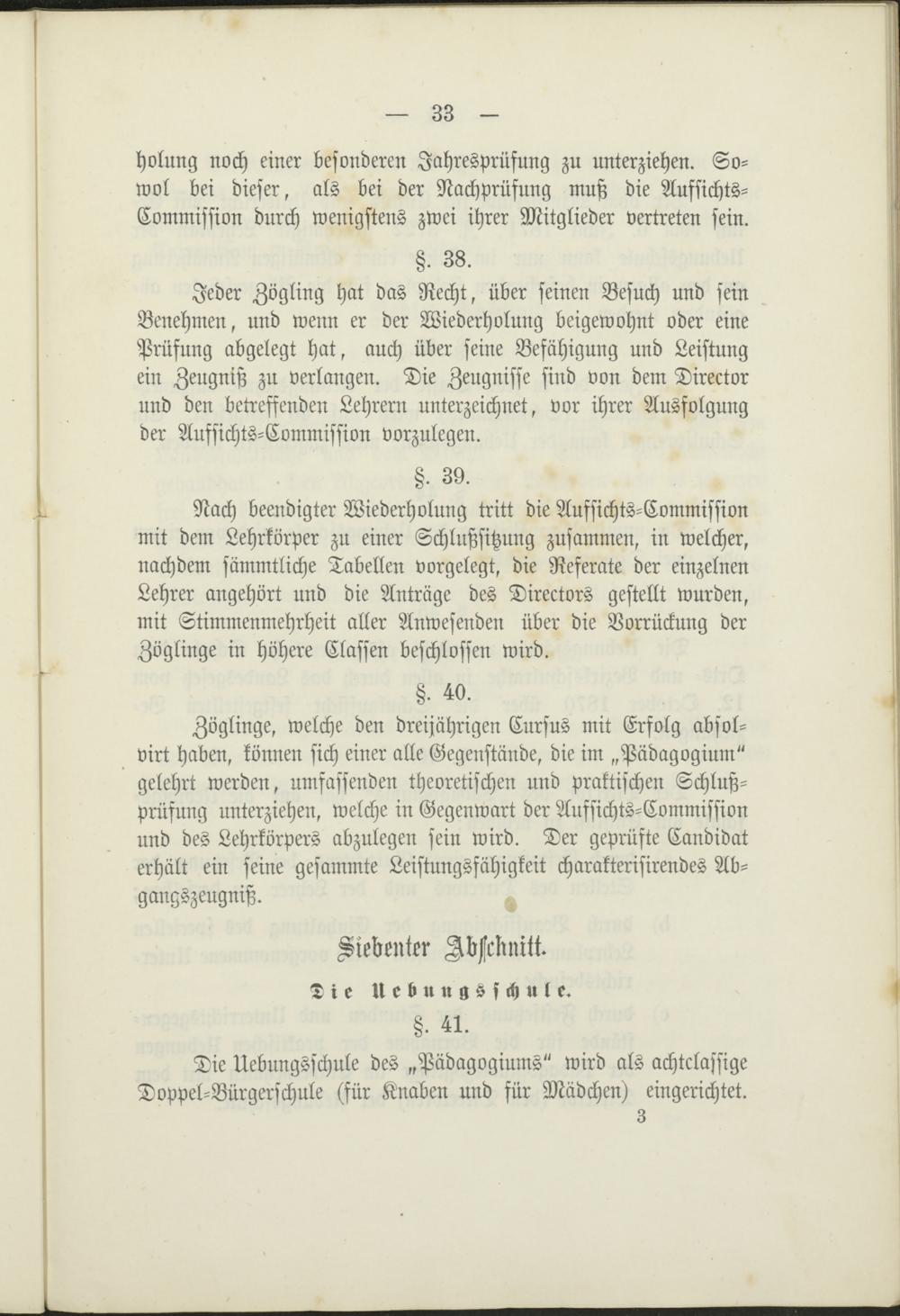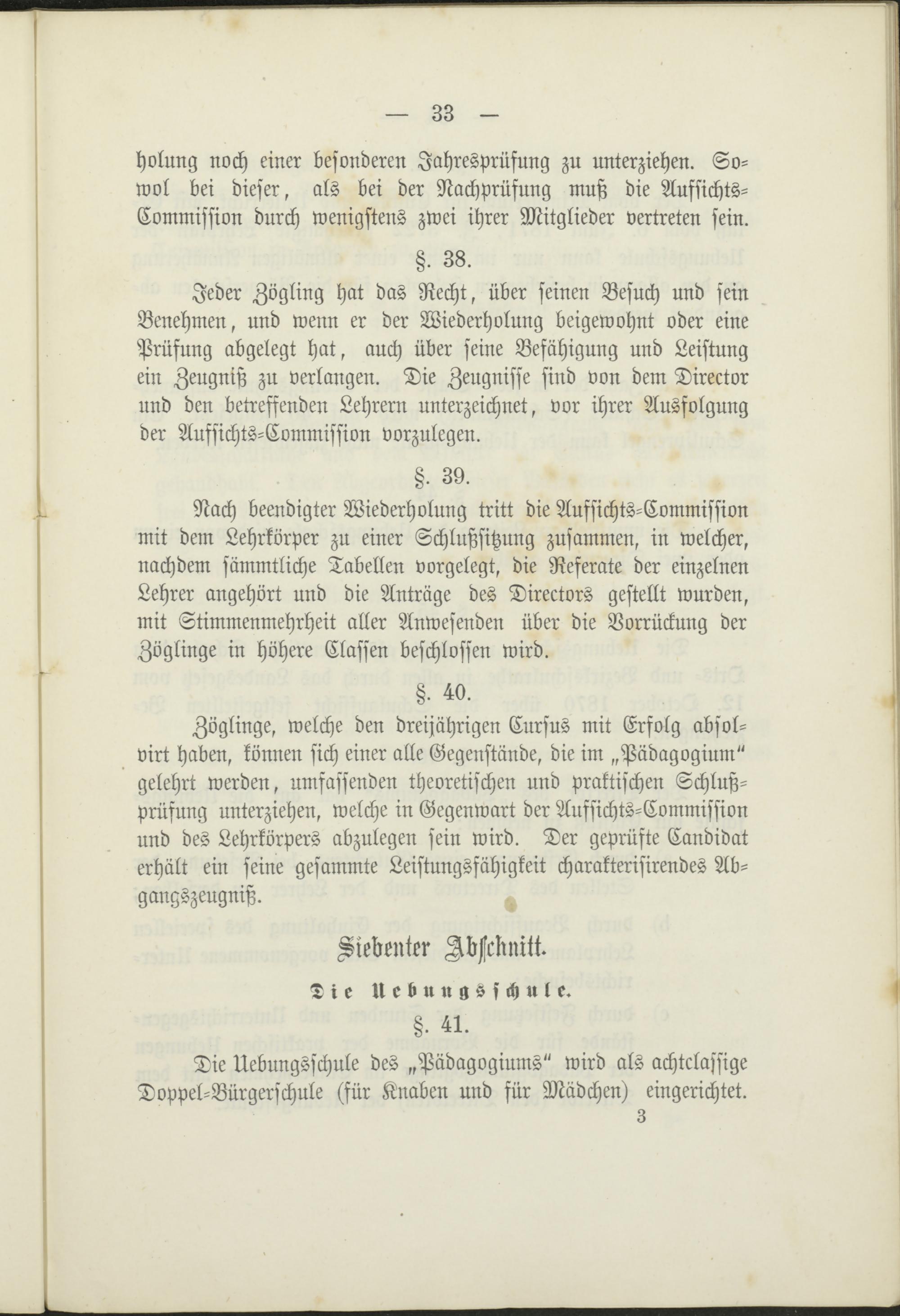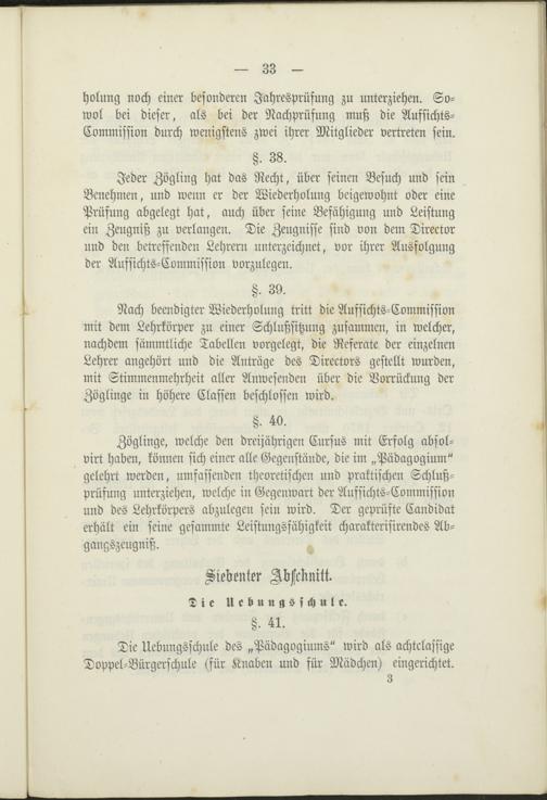 Jeder Zögling hat das Recht, über seinen Besuch und seinBenehmen, und wenn er der Wiederholung beigewohnt oder einePrüfung abgelegt hat, auch über seine Befähigung und Leistungein Zeugniß zu verlangen. Die Zeugnisse sind von dem Directorund den betreffenden Lehrern unterzeichnet, vor ihrer Ausfolgungder Aufsichts-Commission vorzulegen.