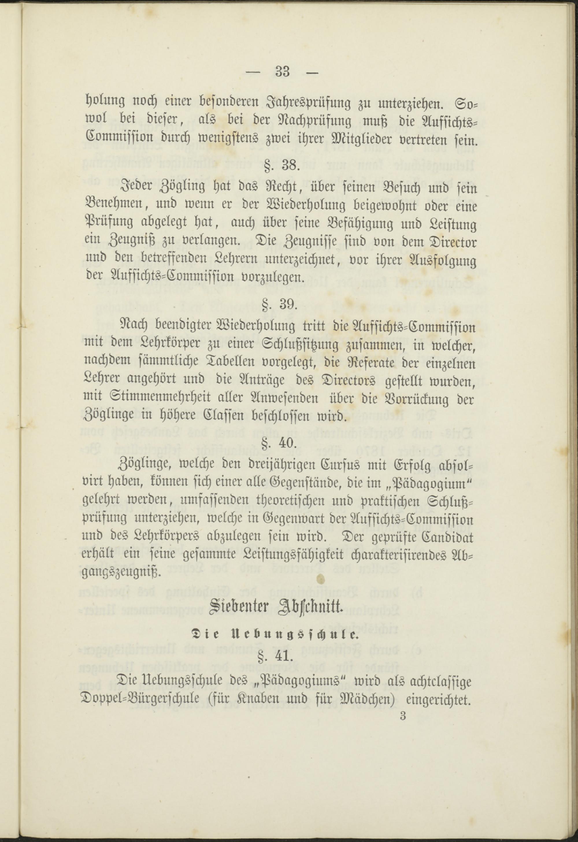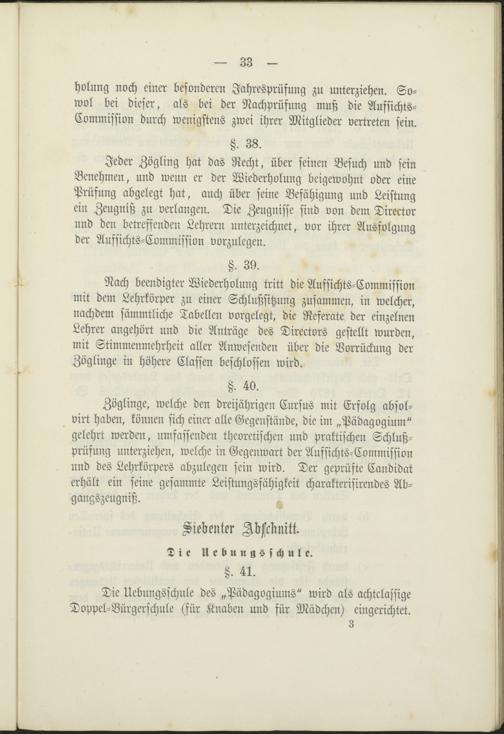 Jeder Zögling hat das Recht, über seinen Besuch und seinBenehmen, und wenn er der Wiederholung beigewohnt oder einePrüfung abgelegt hat, auch über seine Befähigung und Leistungein Zeugniß zu verlangen. Die Zeugnisse sind von dem Directorund den betreffenden Lehrern unterzeichnet, vor ihrer Ausfolgnngder Aufsichts-Commission vorzulegen.